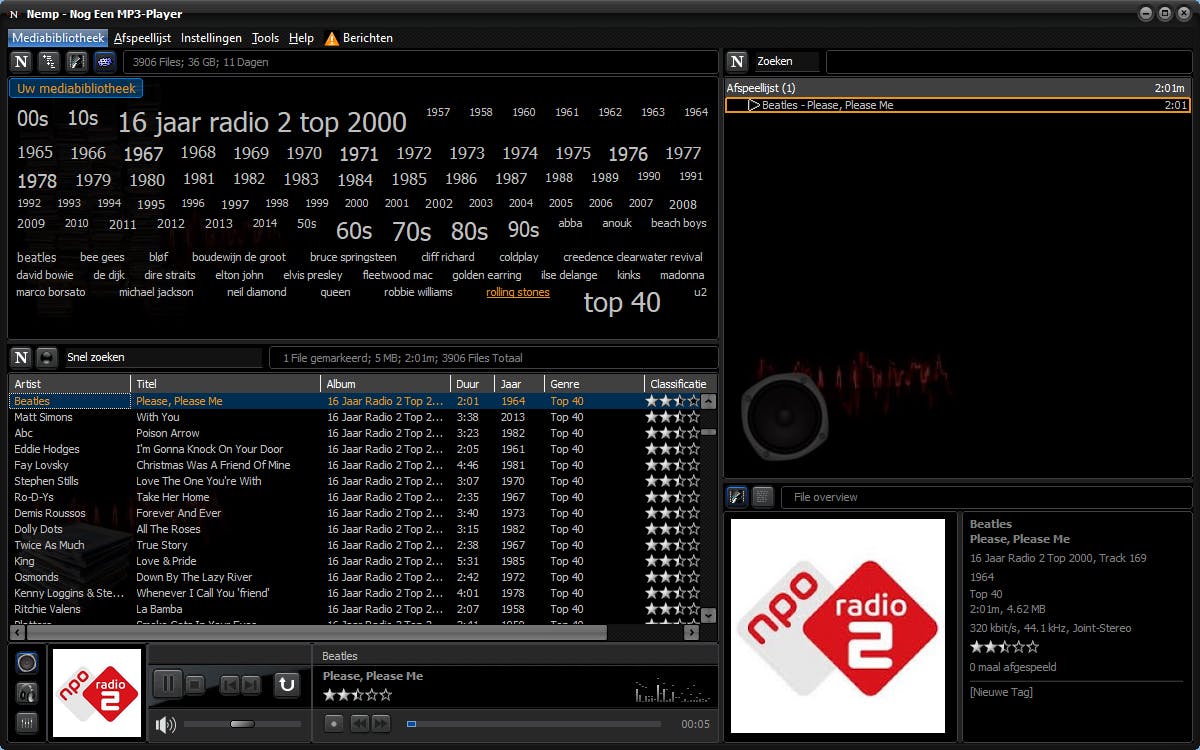 Er is geen enkele reden om van de muziekspeler van Windows af te stappen wanneer je er tevreden over bent, maar veel mensen willen meer. En als er één programma is dat ‘meer’ in overvloed in de praktijk brengt, dan is het wel Nemp, dat staat voor Noch ein Mp3-Player. Nemp is allereerst een muziekspeler en het programma klaart die klus dan ook met verve. Je kunt er zelfs allerlei leuke audio-effecten aan toevoegen en Nemp biedt ook een goede equalizer. Tot zover niets bijzonders. Het programma fungeert echter ook als muziekdatabase. Je begint met het toevoegen van je (getagde) muziek aan de database van Nemp en vervolgens kun je van daaruit nummers op een playlist zetten. Het programma kan daarbij automatisch nummers die je vaak afspeelt van een hogere waardering voorzien en ontbrekende hoesjes ophalen voor het onderdeel Coverflow. Ook biedt Nemp een webserver zodat je je collectie vanuit een browser kunt benaderen wanneer je onderweg bent.