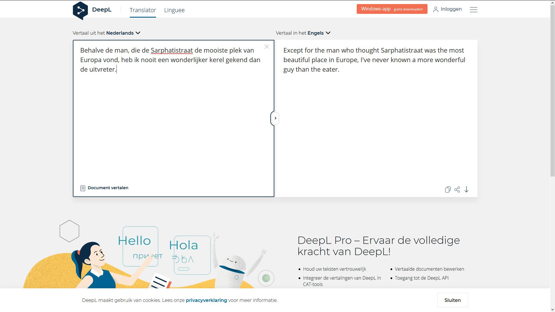 Wanneer we bovenstaande zinnen aan beide diensten aanbieden, zijn er merkbare verschillen, zo kan Google bijvoorbeeld niets met de uitdrukking ‘steken laten vallen’. Bijkomend voordeel van DeepL is dat je er ook Word- en Powerpoint-documenten mee kunt laten vertalen (natuurlijk gebruik je het niet voor privacygevoelige zaken!). DeepL ondersteunt vooralsnog alleen Nederlands, Duits, Engels, Frans, Spaans, Portugees, Italiaans, Pools en Russisch. Dat valt in het niet bij de tientallen exotische talen die Google ondersteunt, maar de meesten van ons zullen de minder gebruikte talen hooguit nodig hebben tijdens de vakantie, en voor dat doeleinde voldoet de Google vertaal-app prima. Voor het vertalen van grote stukken tekst naar onze buurtalen kiezen wij liever voor DeepL.