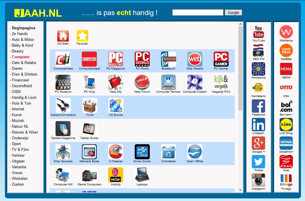 Nu kun je alles wat je wilt vinden natuurlijk via een zoekmachine bereiken, maar dat vergt veel getyp. Hoe ver zou je komen met alleen klikken? Een mooie plek om dat te testen is de indexpagina van jaah.nl. Hier kun je via pictogrammen sites in allerlei categorieën vinden en daarbij zitten weer de nodige sites die een vergelijkbaar principe hanteren. Je bent vaak in enkele klikken waar je wezen wilt.