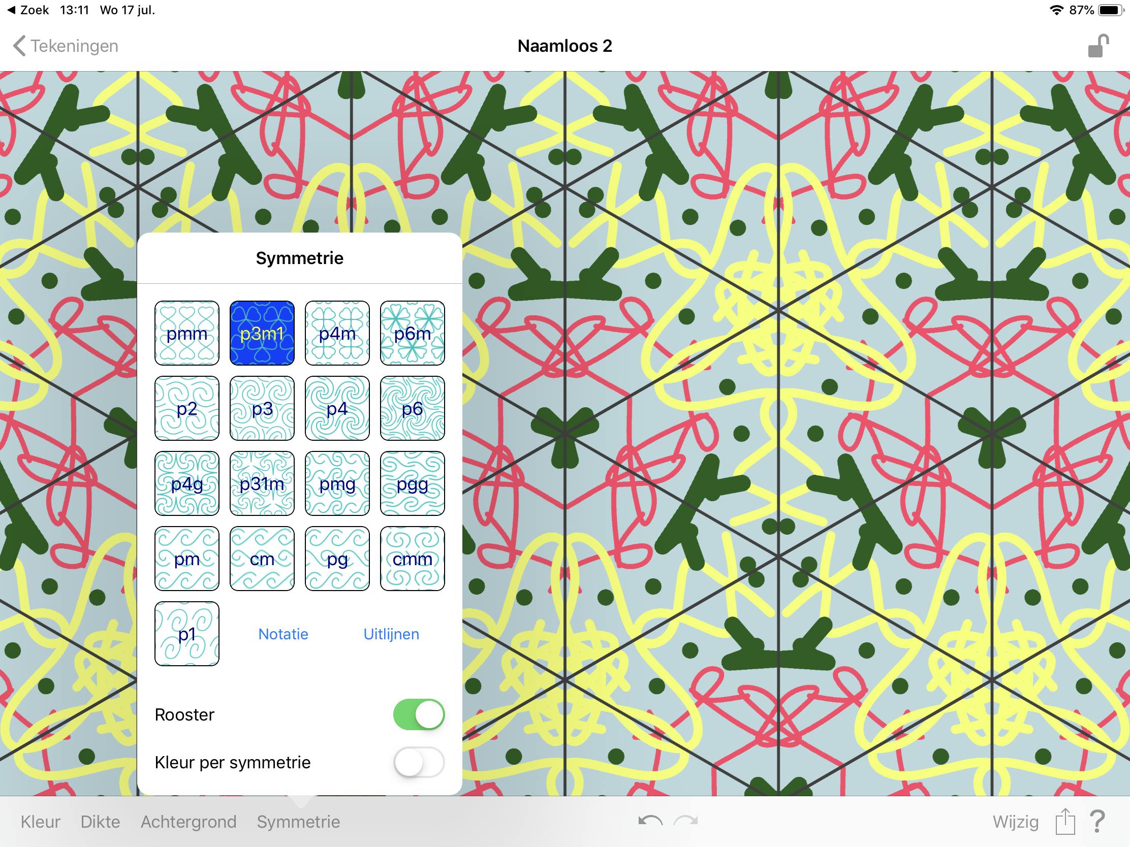 In het Victoriaanse Engeland was een bepaalde kleur groen behang jarenlang zeer populair. Die mooie kleur (die ook werd gebruikt in kleding, kaarsen en kinderspeelgoed) werd verkregen uit een verbinding van arsenicum en jarenlang had niemand een idee hoe gevaarlijk dat was. De kleurstof maakte dan ook vele slachtoffers voordat hij in onbruik raakte. De makers van al die eindeloos herhalende behangpatronen hadden het overigens ook niet makkelijk, want al die ontwerpen moesten met de hand gemaakt worden. Nee, dan hebben ontwerpers van nu het beter, want nu zijn er programma’s waarmee je razendsnel patronen tekent in elk van de 17 symmetrievariaties die mogelijk zijn. Daarvoor gebruik je de app KaleidoPaint (ook voor Android). Kies de gewenste symmetrie, kleur en lijndikte en de app maakt een oneindig patroon. Schakel naar een andere symmetrie en het patroon verandert meteen mee. Vind je het resultaat wat al te regelmatig, dan kun je er ook voor kiezen elke symmetrie een eigen kleurlaag te geven en er zo meerdere samen te voegen. Op elk ontwerp kun je zeer ver in- en uitzoomen voor optimale controle.