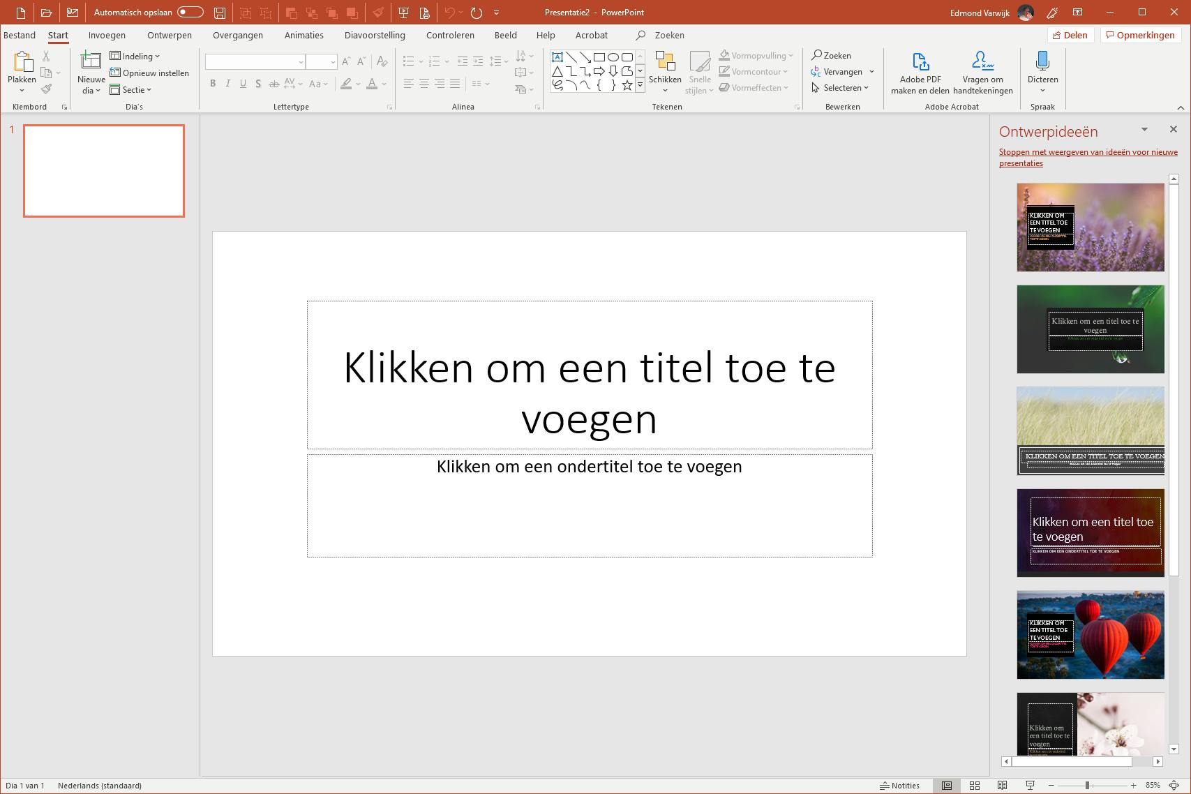 Dat PowerPoint veel in z’n mars heeft, maar de meeste gebruikers maar nauwelijks iets van dat potentieel gebruiken, weet Microsoft ook. Maak je gebruik van Office 365 en wil je een presentatie in PowerPoint gaan maken, dan krijg je meteen al een groot aantal grafisch best aantrekkelijke opties om je presentatie vorm te geven. Voor een haastklus is zo’n vooringesteld sjabloon ook helemaal geen slechte keuze. Ben je je presentatie aan het maken, en heb je inspiratie nodig voor en creatieve dia-indeling, raadpleeg dan Ontwerpen / Ontwerpideeën, hiermee helpt Microsoft je een flink eind op weg. Toch is het geen oplossing voor een presentatie die echt moet knallen. Daarvoor worden er te vaak helemaal geen ontwerpideeën weergegeven en blijf je uiteindelijk alsnog met een vrij standaard presentatie achter.