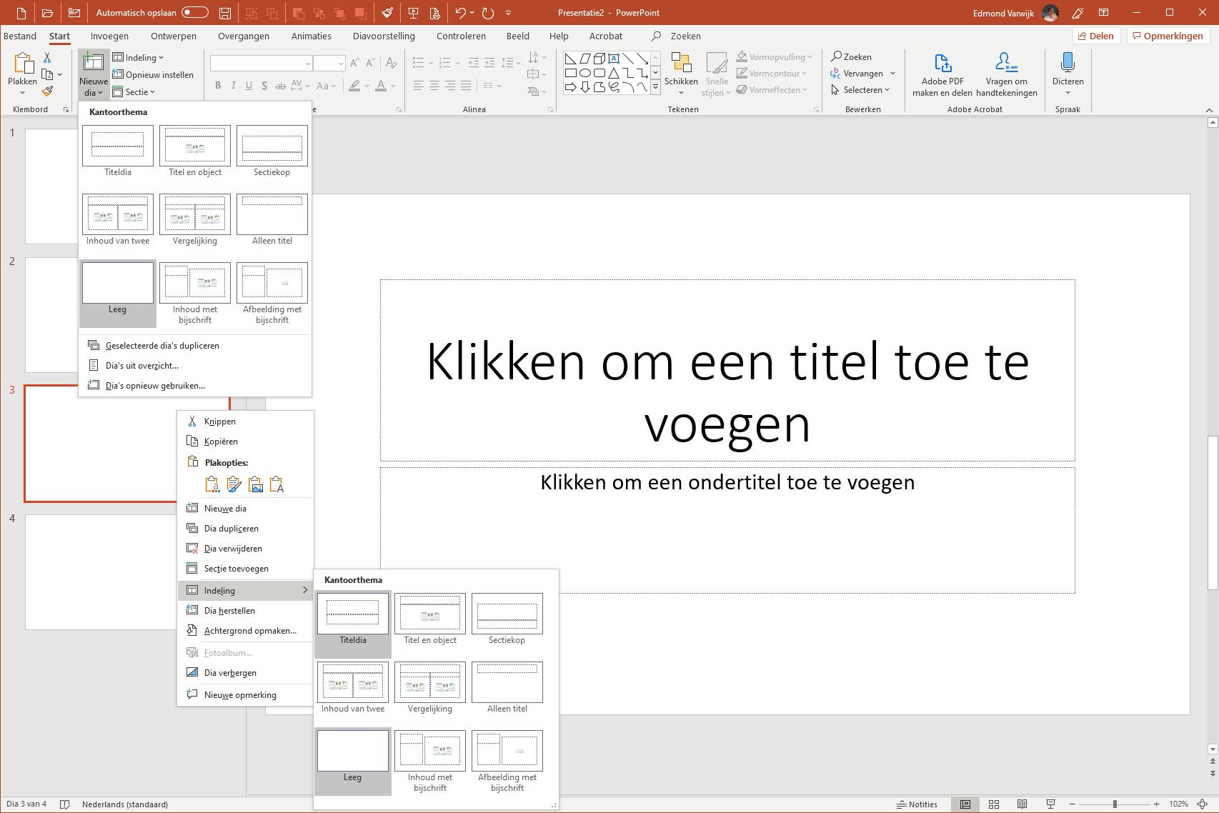 Elke dia in PowerPoint heeft een standaardindeling. Voorbeelden zijn bijvoorbeeld een titel met een subtitel, een titel met een foto eronder of een dia met inhoud en tekst. Deze standaardindelingen zijn handig als je tekstuele inhoud wilt tonen, maar voor grafische effecten zijn die indelingen vooral lastig. Je wilt dan gewoon een lege dia, zodat je niet gehinderd wordt door allerlei vakken. Om van een bestaande dia de indeling aan te passen, klik je met de rechtermuisknop op de dia in het voorbeeldvenster en kies Indeling / Leeg. Voeg je een nieuwe dia toe, dan kun je via Dia’s / Nieuwe dia meteen de gewenste indeling kiezen.