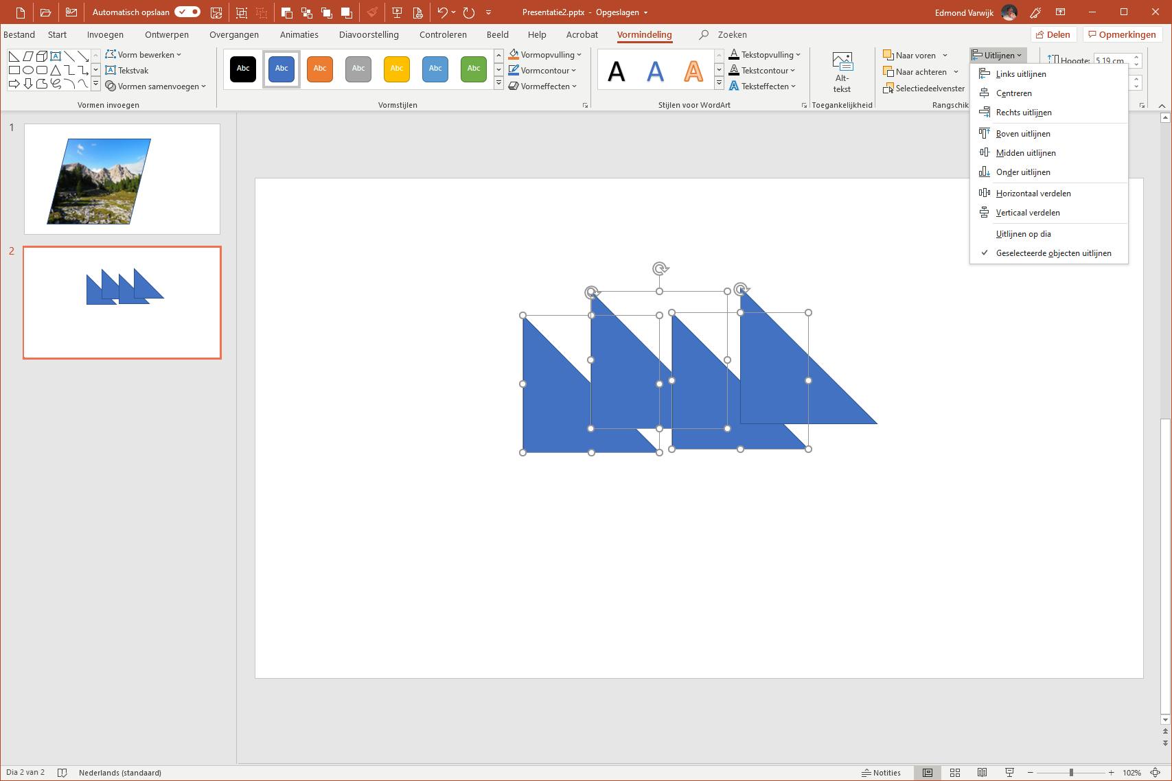 Wil je een presentatie er grafisch interessant uit laten zien, dan spelen vormen een belangrijke rol. Het is daarom handig iets meer te weten van het werken met vormen. Een eerste handigheid heeft te maken met het invoegen van een vorm. Met Shift ingedrukt maakt PowerPoint namelijk alle zijden van een vorm automatisch even groot. Een rechthoek wordt dus een vierkant, een driehoek een gelijkbenige driehoek en een rondje een echte cirkel. Standaard wordt de vorm naar één kant uitgerekt, die waarin je de muis beweegt. Maar druk je hierbij de Ctrl-toets in, dan wordt de vorm in beide richtingen groter gemaakt. Om een vorm te dupliceren, gebruik je de toetscombinatie Ctrl+D waarna je de gekopieerde vorm kunt verplaatsen. Ook kun je Ctrl ingedrukt houden terwijl je de vorm met de muis naar een andere plek sleept. Een geselecteerde vorm kun je via de ronde pijl erboven draaien, maar dit kan ook heel precies via Vormindeling / Rangschikken / Draaien. Dit menu biedt ook de mogelijkheid een vorm te verticaal of horizontaal te spiegelen. Heb je meerdere vormen en wil je ze op dezelfde hoogte uitlijnen, selecteer dan met de muis de desbetreffende vormen door er een vierkant overheen te slepen, of klik, met de Ctrl-toets ingedrukt, op alle vormen die je wilt uitlijnen. Kies vervolgens voor Vormindeling / Rangschikken / Uitlijnen en selecteer hoe je de vormen wilt uitlijnen.