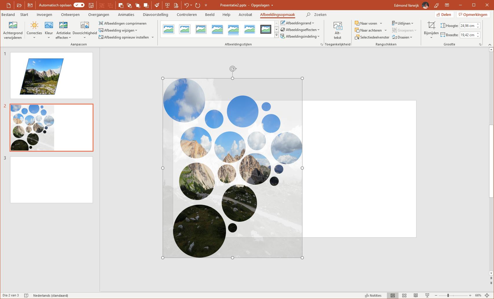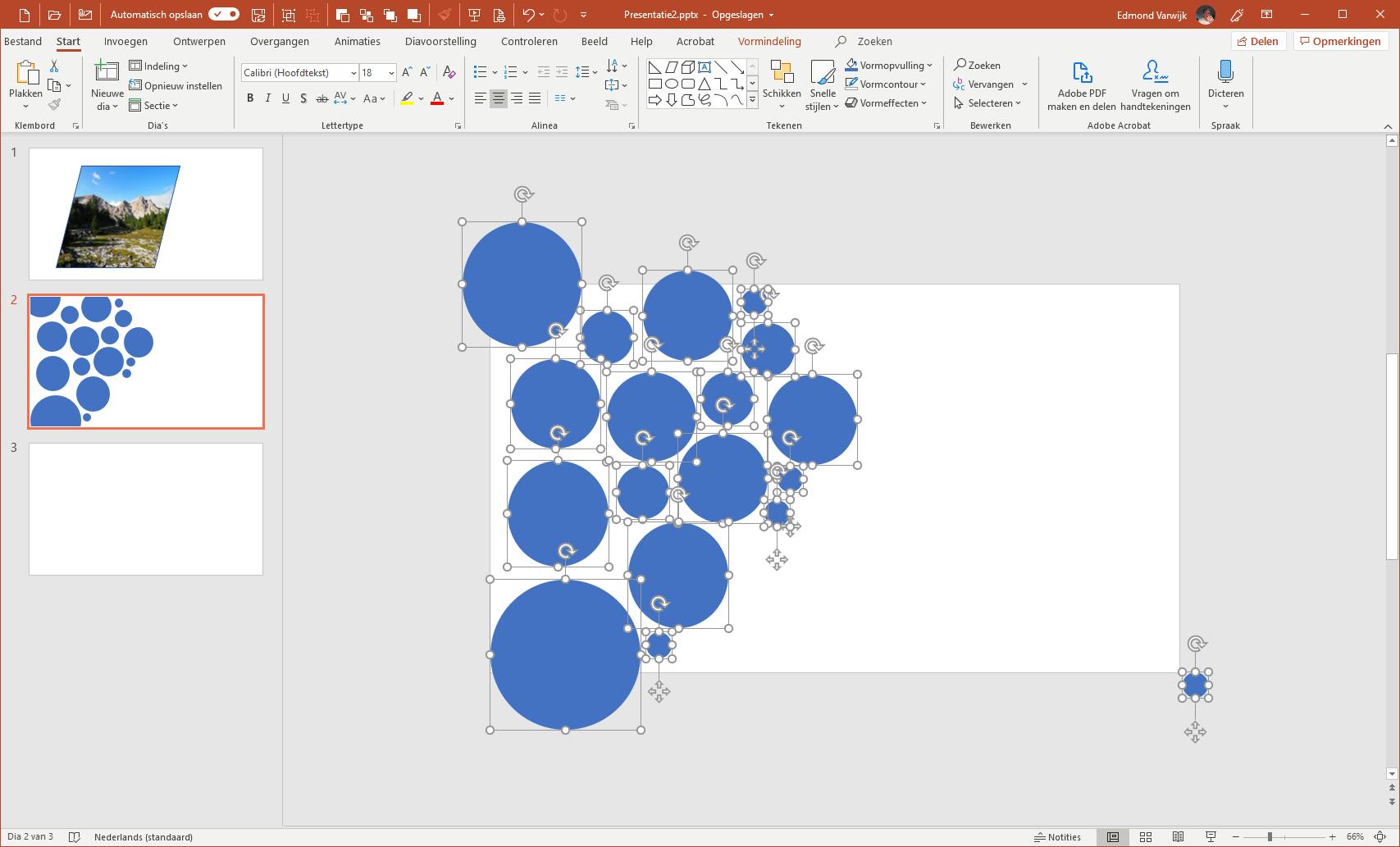 Wil je op je dia een afbeelding in een vorm die je niet tussen de standaard vormen kunt vinden? Maak ‘m dan zelf door meerdere vormen samen te voegen. Maar hiervoor een nieuwe dia met een lege indeling aan. Voeg een cirkel toe via Invoegen / Vormen en selecteer Ovaal. Teken een ovaal en druk op Shift om er een cirkel van te maken. Druk op Ctrl+D om de cirkel te dupliceren en zet de nieuwe cirkel naast de eerste. Maak die cirkel nu kleiner of groter. Voeg meer cirkels toe tot er een aantrekkelijke vorm met meerdere cirkels van verschillende groottes ontstaat. Maak ook enkele cirkels die over de rand van de dia gaan. Is de compositie naar tevredenheid, selecteer dan alle cirkels, bijvoorbeeld met Ctrl+A. Haal nu eerst de lijntjes rond de vormen weg via Vormindeling / Vormcontour / Geen contour. Met nog steeds alle vormen geselecteerd, maak je via Vormindeling / Rangschikken / Groeperen / Groeperen van alle losse vormen één vorm. De gegroepeerde vorm is automatisch geselecteerd. Klik dan op Vormindeling / Vormstijlen / Vormopvulling en kies weer Afbeelding / Uit een bestand. Selecteer een afbeelding en kies Invoegen. De afbeelding wordt nu in alle vormen geplaatst, wat best een mooi effect kan geven.