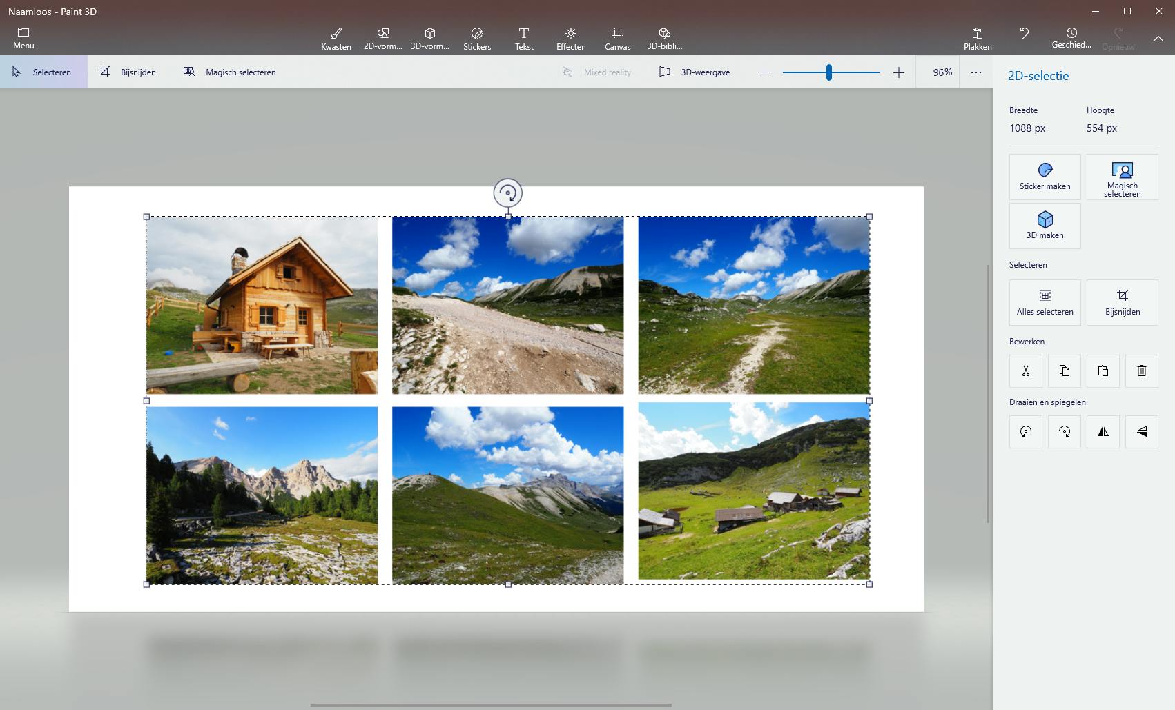 Een nog mooier effect kun je bereiken met meerdere foto’s. Voeg een lege dia toe en kies Invoegen / Afbeelding. Voeg nu zes foto’s toe die ofwel alle zes het portretformaat hebben (rechtopstaand) of alle zes het landschapsformaat hebben (liggend). Klik de foto’s met Ctrl ingedrukt aan en voeg ze in één keer toe aan de dia. Selecteer vervolgens alle zes de foto’s door er met de muisknop ingedrukt een rechthoek omheen te slepen. Zet nu de muisknop op een van de vulgrepen (de witte rondjes op de hoek van de selectie) en maak de foto’s in één keer allemaal tegelijk kleiner zodat ze klein genoeg zijn om samen op een dia te passen. Klik nu naast de foto’s om de selectie op te heffen en zet de foto’s netjes naast elkaar met tussen de foto’s telkens een even grote tussenruimte. De automatische uitlijning van PowerPoint kan je hierbij helpen. Selecteer opnieuw alle foto’s en plaats ze op het klembord met Ctrl+X of Start / Klembord / Knippen. Open vervolgens het programma Paint 3D. Klik op Nieuw en plak dan met Ctrl+V de inhoud van het klembord in het 3D-document. Klik nu op 3D Maken en klik dan op Menu / Opslaan als / 3D-Model om het 3D-model op uw computer te bewaren.
