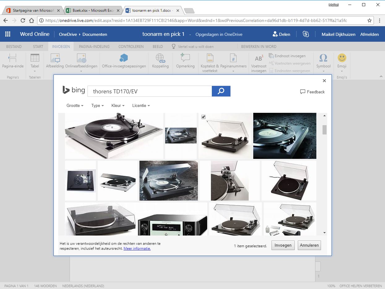 Tekstverwerken in Word Online gaat uitstekend, want alle veelgebruikte opmaakfuncties zijn binnen handbereik. Zo maak je woorden cursief (ook gewoon via de toetscombinatie Ctrl+I) en geef je de letters een kleurtje. Verder voeg je opsommingstekens en nummers toe en laat je tekst inspringen. Bedenk wel dat de online versie minder lettertypes kent, al zijn het er nog altijd ruim veertig. Je hebt toegang tot stijlen om de tekst een logische structuur te geven en er is een uitgebreide zoekfunctie. Via het tabblad Invoegen upload je desgewenst afbeeldingen vanaf de harde schijf, al kun je ook plaatjes via de cloudomgeving OneDrive en zoekmachine Bing toevoegen. Ga voor laatstgenoemde optie naar Onlineafbeeldingen / Foto’s van Bing en voer een trefwoord in. Gevonden afbeeldingen hevel je rechtstreeks naar het document over. Wie bang is om taalfouten te maken, onderwerpt de tekst aan een spelingscontrole. Functies om webvideo’s en artistieke WordArt-letters toe te voegen, vind je in Office Online helaas niet terug.