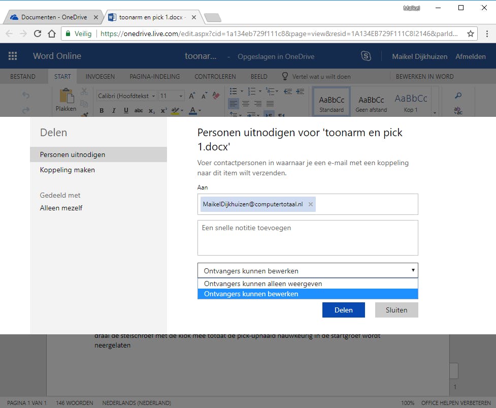 Je deelt vanuit Office Online eventueel documenten, waarna meerdere deelnemers zelfs gelijktijdig de inhoud kunnen aanpassen, zonder dat je daarbij het risico hebt op meerdere versies van één document. Klik in een tekstdocument, spreadsheet of presentatie rechtsboven op Delen. Vervolgens typ je één of meerdere e-mailadressen van de gewenste deelnemer(s). Voeg naar eigen inzicht een korte notitie toe. Wil je liever niet dat de persoon in kwestie het document gaat bewerken? Klik dan onderaan op Ontvangers kunnen bewerken en kies voor de optie Ontvangers kunnen alleen weergeven. Je past de rechten naderhand eventueel nog aan. Bevestig met Delen.
