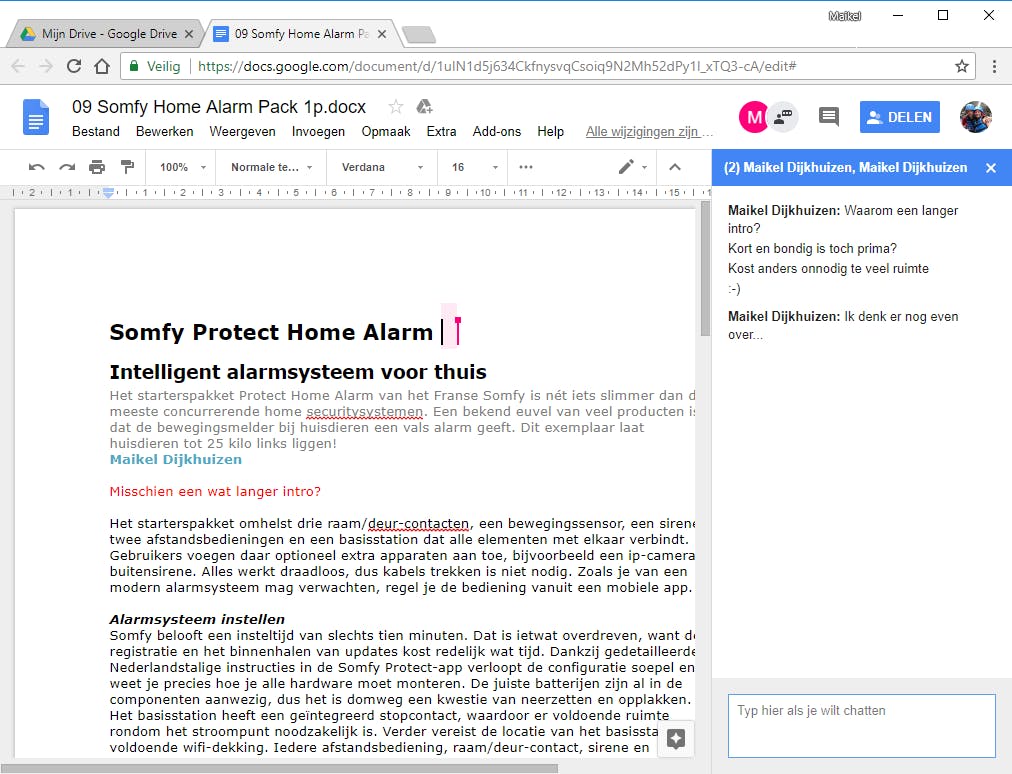 Waar Microsoft sinds twee jaar een beroep doet op het Skype-platform om onderling te overleggen, bevat Google Drive ook een geïntegreerde chatfunctie. Wel is er een belangrijk verschil, want videogesprekken zijn vanuit online Google-documenten niet mogelijk. Deze chatfunctie is vergeleken met die van Office Online simpeler uitgewerkt en daardoor ook eenvoudiger in gebruik. Open een document waaraan je met één of meerdere personen samen wilt werken en klik rechtsboven op de blauwe knop Delen. Er verschijnt een venster waarin je de e-mailadressen van de beoogde deelnemers typt. Standaard krijgt iedereen rechten om het document te bewerken. Wil je dat liever niet? Via het pictogram met het potloodje selecteer je de optie Mag reageren of Mag weergeven. Bevestig nu met Verzenden. Rechtsboven zie je welke personen er gelijktijdig in het document aan het werk zijn. Wijzigingen verschijnen realtime op het scherm. Klik bovenaan op het pictogram Chatvenster weergeven om met andere deelnemers te discussiëren.