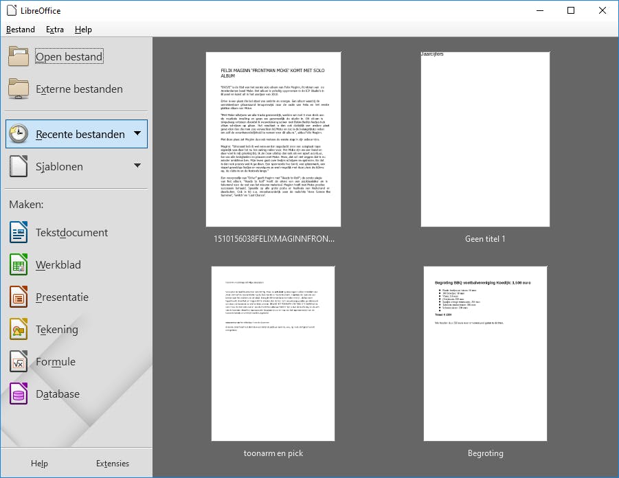 Klik hier op groene knop om de laatste versie te downloaden. De software is beschikbaar voor Windows 7/8/10, macOS 10.6+ en Linux. Overigens hebben veel Linux-distributies standaard al LibreOffice ingebouwd, zoals Linux Mint en Ubuntu. Geef tijdens de installatieprocedure in Windows aan of je de software voortaan gelijktijdig met het besturingssysteem wilt opstarten. Na de installatie vind je zes losse programma’s op de computer terug, waaronder Writer (tekstdocumenten), Calc (spreadsheets) en Impress (presentaties). Er is daarnaast een beginscherm dat gebruikers toegang geeft tot alle applicaties. Hier vind je ook recent geopende bestanden, maar logischerwijs is dit deel momenteel nog leeg. Via Bestand / Openen selecteer je een bestaand bestand, bijvoorbeeld een document die je eerder met MS Office hebt gemaakt.