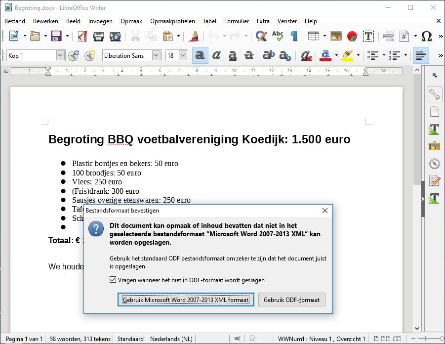 Als je al bekend bent met Microsoft Office, kost het vermoedelijk weinig tijd om aan LibreOffice te wennen. Net als bij zijn commerciële concurrent heeft ieder programma aan de bovenzijde een uitgebreide knoppenbalk. Voor het lokaal opslaan van documenten ga je naar Bestand / Opslaan als. Weliswaar ondersteunt LibreOffice hierbij recente Microsoft Office-indelingen (docx, xlsx, pptx), maar bestanden tussen beide pakketten onderling uitwisselen gaat lang niet altijd goed. Niet voor niets verschijnt er dan ook een melding dat LibreOffice mogelijk niet alle opmaak en inhoud correct opslaat. Neem je liever geen risico, dan is het OpenDocument-formaat (odf) een veiliger bestandstype.