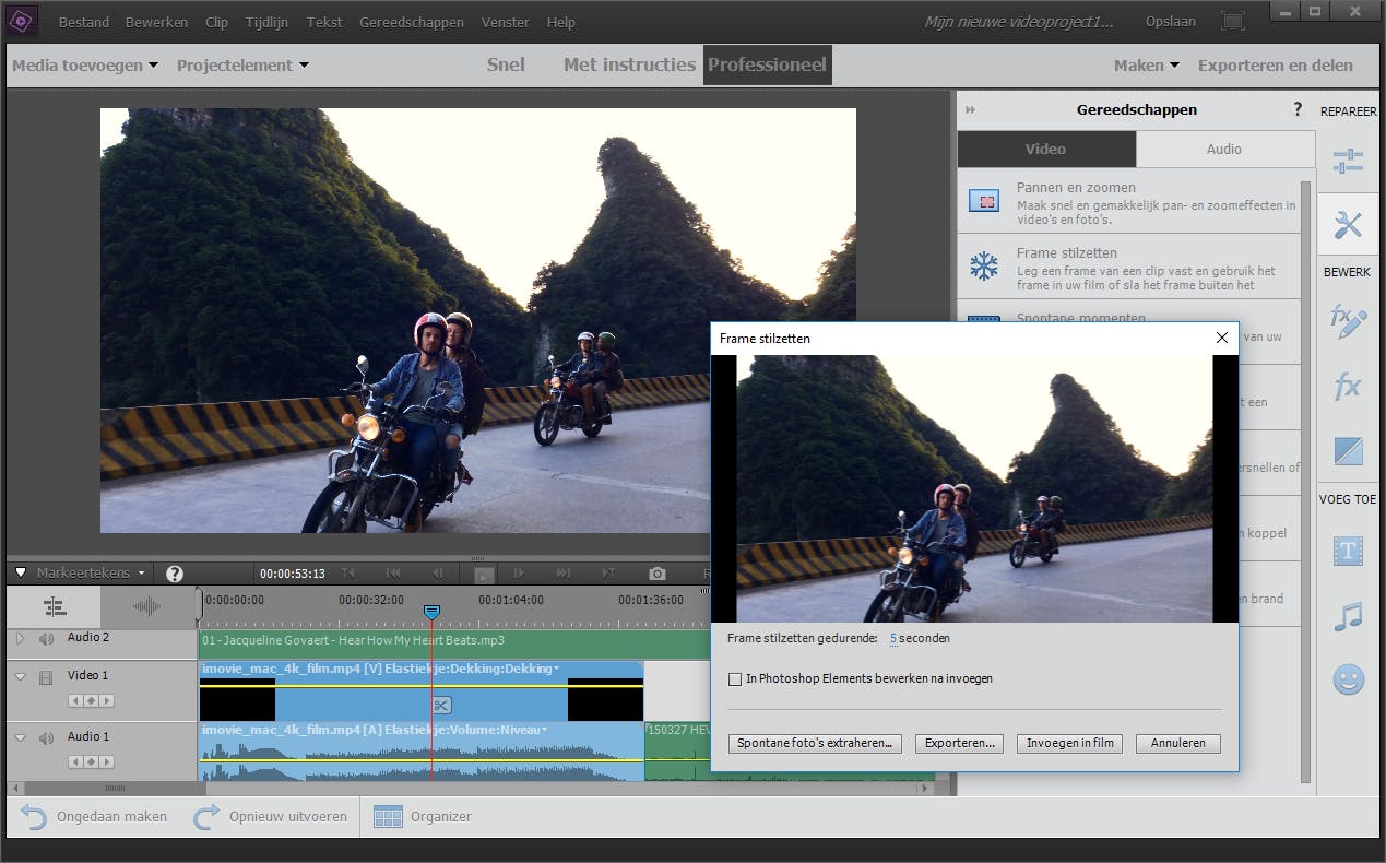 Zoals we van Adobe Premiere Elements al jarenlang gewend zijn, verzamel je alle mediabestanden in de uitgebreide Organizer. Dankzij het gebruik van tags vind je vlot de gewenste filmpjes door bijvoorbeeld een locatie of naam van een persoon op te geven. Handig voor uitgebreide collecties! Een minpunt is dat Premiere Elements de bestandscontainer mkv en de videcodec h.265/hevc niet herkent. Vanuit de Organizer hevel je videoclips soepel over naar het bewerkingsvenster, waarna je de film met allerlei gelikte thema’s en sjablonen kunt vormgeven. De interface oogt erg overzichtelijk, al kun je deze videobewerker ook in professionele modus oproepen, die wat overweldigender oogt. Fijn zijn ook de Nederlandse stap-voor-stap-instructies. Adobe is er weer in geslaagd om een aantal interessante nieuwigheden in te bouwen. Zo licht je een bepaald videoframe uit door het beeld even stil te zetten. Vervolgens laat je een titel de film ‘binnenvliegen’. Verder laat je een kort videofragment meermaals voor- en achteruit afspelen, waarna je het resultaat bewaart als gif-animatie. Ook bezitters van een actiecamera kunnen met dit softwarepakket uit de voeten, want bijsnijden en stabiliseren zijn voor deze videobewerker geen enkel probleem. Een gemiste kans is dat je het eindresultaat niet rechtstreeks op blu-ray kunt branden. Premiere Elements is ook als bundel met Photoshop Elements verkrijgbaar. Hiervoor betaal je 151,25 euro.