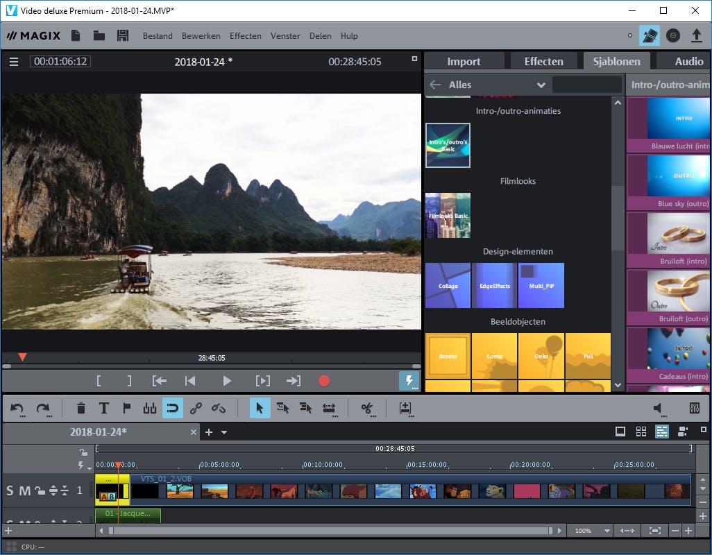 Wat betreft de bestandsondersteuning valt er niets op Video deluxe Premium aan te merken. Veelgebruikte containers als m2ts, mov, mkv (h.265/hevc) en vob accepteert deze videobewerker resoluut. Voor activatie van de hevc-codec is er helaas wel een extra betaling van 4,99 euro vereist. Waar eerdere versies van Magix’ videobewerker nog weleens stabiliteitsproblemen kenden, is daar nu niets meer van te merken. De huidige editie heeft een vlotte navigatiestructuur en voert bewerkingen soepel uit. De bewerkingsopties zijn behoorlijk uitgebreid. De interface bevat bijvoorbeeld uitgebreide gereedschappen om multicam-video te maken en panoramabeelden te optimaliseren. Ook kun je objecten blurren en video’s op de beat van een soundtrack monteren. Een goede toevoeging zijn de fraaie animaties om een film te beginnen of juist te beëindigen. Nieuw is de mogelijkheid om staande video’s beeldvullend te maken via een beeldrandeffect. Voor audiofanaten is er ondersteuning voor Dolby Digital-geluid, zodat je het videoproject kunt voorzien van een surround-spoor. De Premium-versie van Video deluxe bevat nogal wat geavanceerde video-effecten. Die installeer je via een aparte licentiecode. Zit je daar niet op te wachten, dan kun je wellicht ook uit de voeten met goedkopere versies als Video deluxe (39,99 euro) of Video deluxe Plus (64,99).
