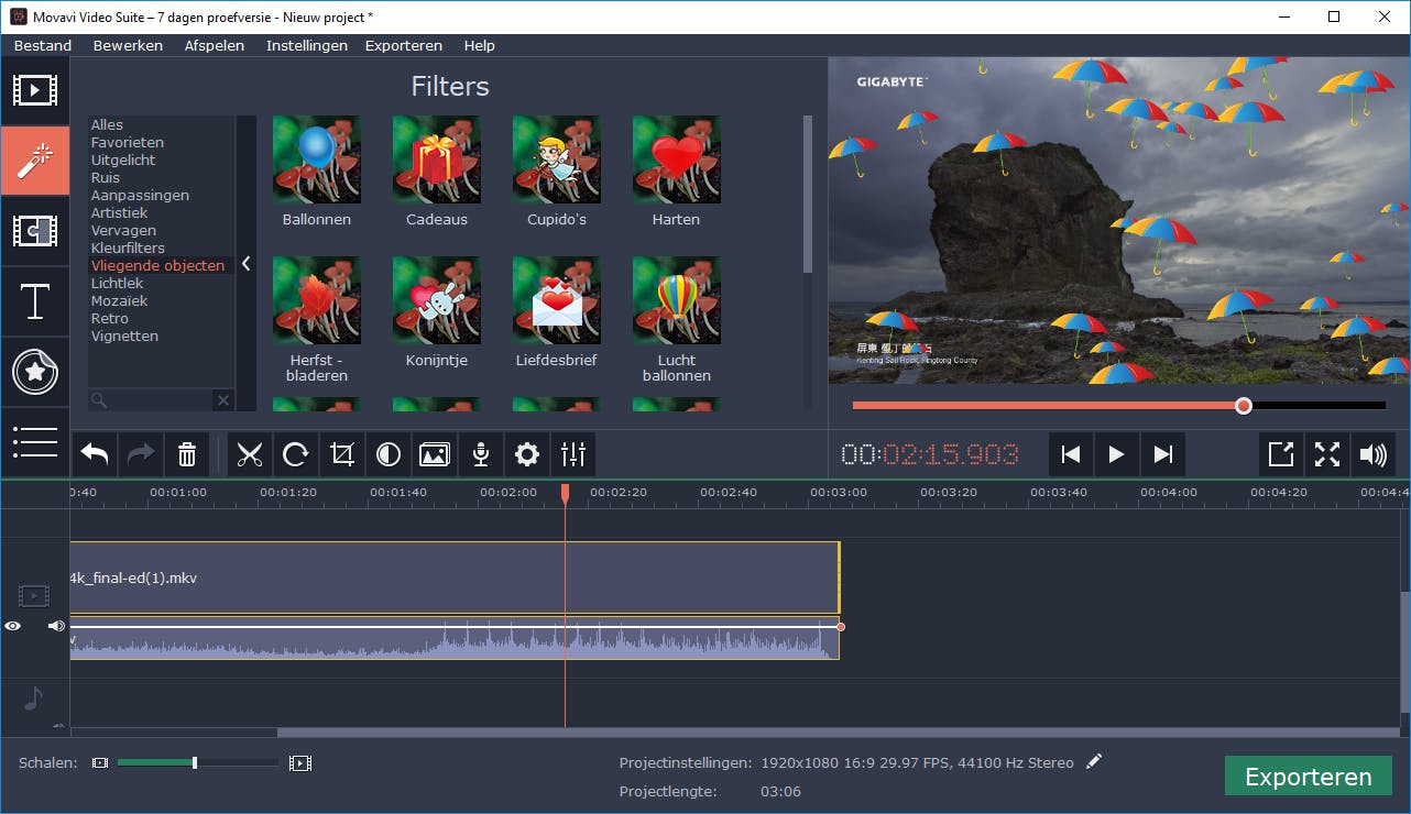 Hoewel het op de website net lijkt of het freeware betreft, betaal je na een proefperiode van zeven dagen 49,95 euro. In tegenstelling tot andere commerciële programma’s is de installatie vanwege het kleine downloadbestand snel gepiept. Video Suite 17 is erg laagdrempelig en neemt beginners mee op sleeptouw. Zo heb je in het introductievenster keuze om een video te bewerken, maar je kunt ook een computerscherm opnemen, video’s splitsen of filmpjes converteren. Voor de videomontage heb je keuze om te bewerken in eenvoudige of volledige modus. De eerste keer verschijnen er Nederlandstalige instructies met een korte uitleg over de tijdlijn, de bewerkingsgereedschappen en het importeren van mediabestanden. Kortom, zeer gebruiksvriendelijk! De h.265/hevc-videocodec in een mkv-container wordt ondersteund, maar vob-bestanden van een dvd-mappenstructuur jammer genoeg niet. Verder heeft Video Suite geregeld moeite om de voorbeeldweergave van het videoproject te laden wanneer er zware mediabestanden aanwezig zijn. Voor wat betreft de bewerkingsgereedschappen bevat deze videobewerker aantrekkelijke overgangen, filters, titelanimaties en (vliegende) objecten. Daarnaast neem je je eigen stem desgewenst als voice-over op en kun je rechtenvrije soundtracks gebruiken. Via een plug-in brand je het eindresultaat op een schijfje, maar rechtstreeks uploaden naar sociale media is niet mogelijk (wel YouTube). Movavi Video Suite is alleen beschikbaar voor Windows, al ontwikkelt deze fabrikant wel andere videobewerkers voor macOS.