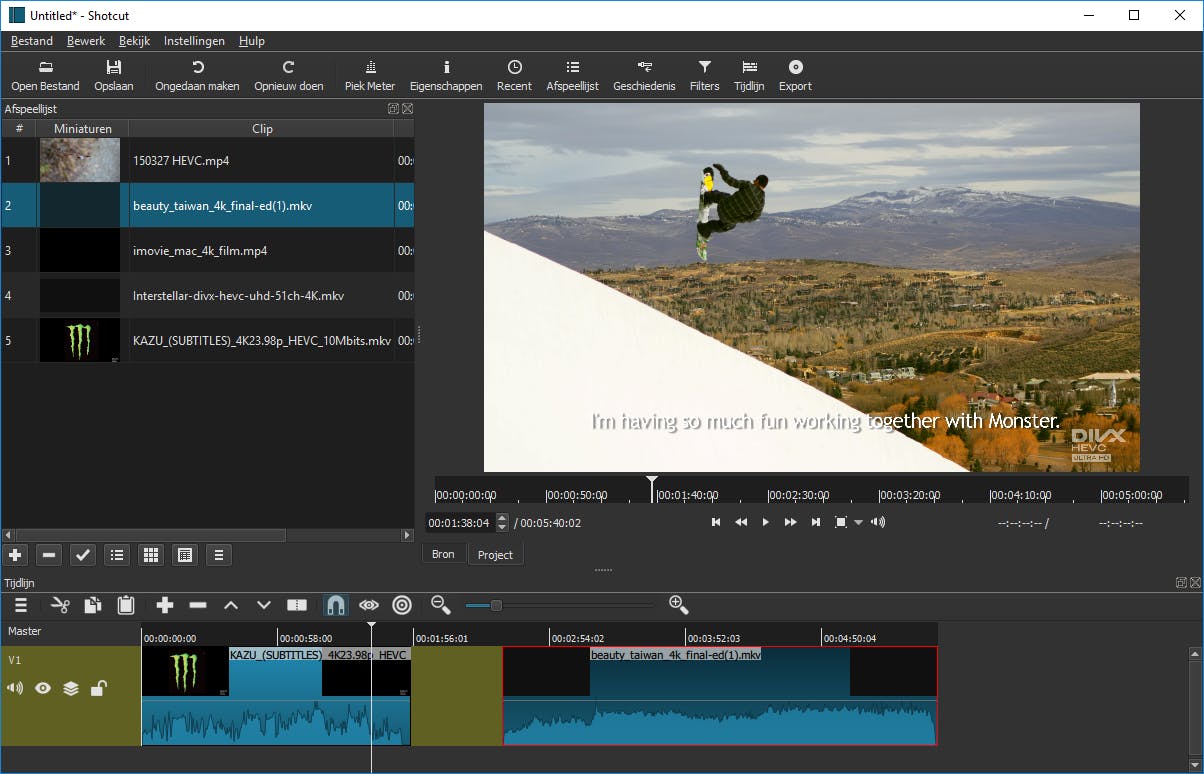 De gebruikersomgeving van Shotcut oogt ietwat kaal, omdat niet alle onderdelen meteen zichtbaar zijn. Je dient de tijdlijn bijvoorbeeld apart te activeren. De bekende montagegereedschappen verschijnen dan ook direct in beeld, zoals een schaartje om ongewenste fragmenten te wissen en een splits-optie. Net als OpenShot Video Editor laat ook deze freeware geen steekjes vallen bij het importeren van video’s. 4K-bestanden met de h.265/hevc-codec en dvd-rips verschijnen moeiteloos in de afspeellijst. In het menu zitten de filters ietwat verstopt. Je wijzigt hiermee onder meer de contrastwaarden, helderheid en kleuren. Veel meer functies hoef je van deze eenvoudige videobewerker niet te verwachten, dus het programma is alleen interessant voor het maken van simpele films. Het eindresultaat exporteer je naar zo’n beetje ieder videoformaat, want de keuze is hierin enorm. Ook stel je hierbij de gewenste resolutie en videocodec in. Rechtstreeks delen op sociale media behoort helaas niet tot de mogelijkheden. De freeware is weliswaar beschikbaar in het Nederlands, maar niet alle onderdelen zijn goed vertaald.