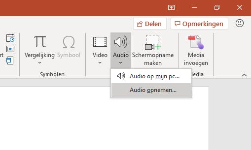 PowerPoint biedt meerdere mogelijkheden om geluid in een presentatie te gebruiken. Om een geluidsfragment in te voegen in een presentatie, klik je in de werkbalk op Invoegen. Bijna helemaal rechts op de balk van het Lint zie je het onderdeel Media. De tweede optie hiervan is Audio. Onder audio zie je een kleine driehoek die naar beneden wijst, dit geeft aan dat er aanvullende opties zijn.