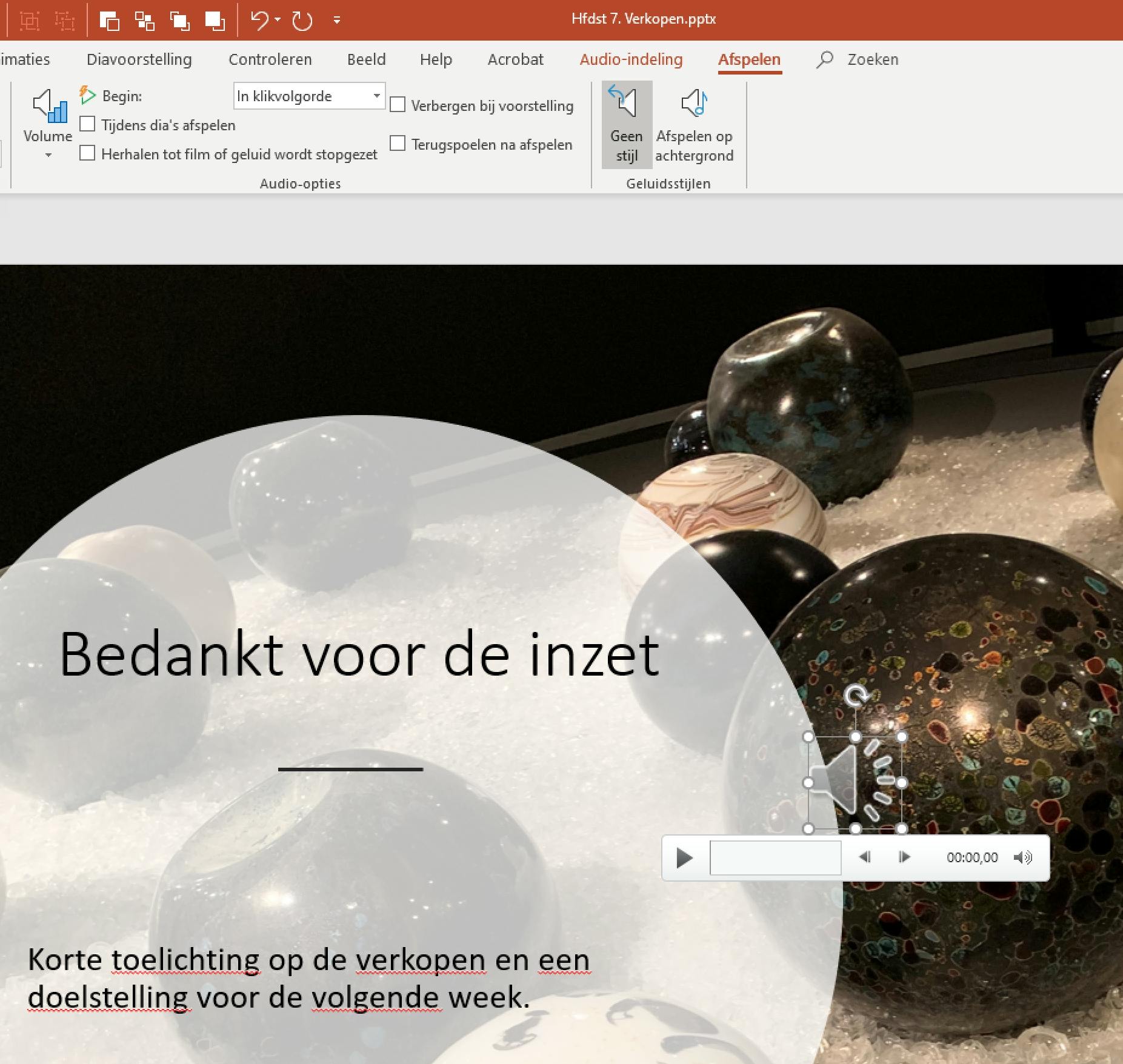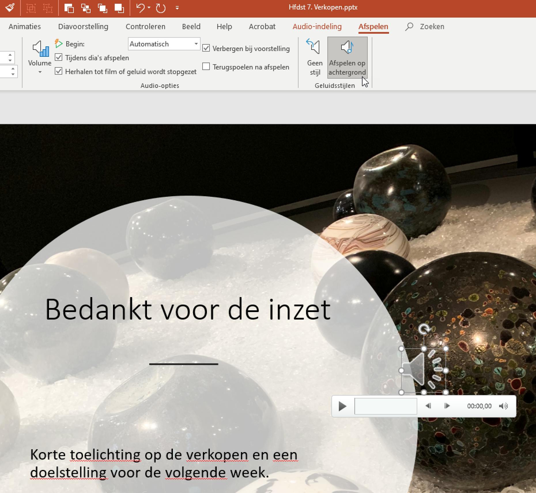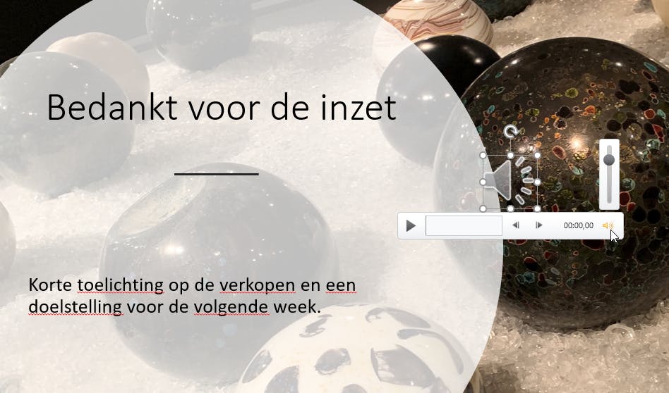 Als je niet wilt dat het publiek weet dat er een geluidsfragment aankomt, dan wil je vast liever dat het pictogram van het geluidsfragment niet prominent in de dia te zien is. Zeker wanneer je het toch automatisch laat afspelen, is het leuker om de optie Verbergen bij voorstelling aan te zetten. In de presentatiemodus, dus wanneer je de presentatie ook echt geeft, is er dan op de dia niet te zien dat er een geluidsfragment in zit. Soortgelijk bereik je met de optie Afspelen op achtergrond. Het geluidsfragment wordt dan automatisch gestart en afgespeeld over meerdere dia’s tot het is afgelopen.