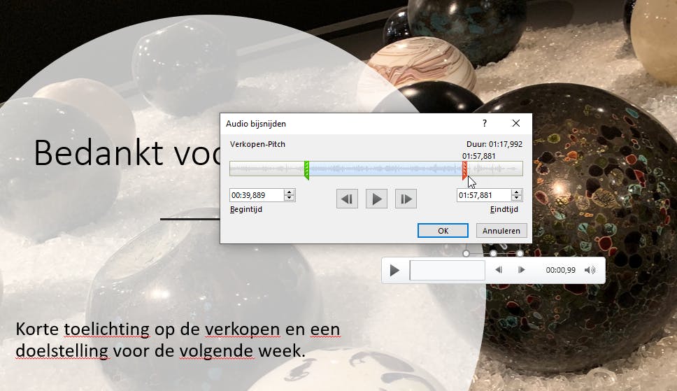 PowerPoint biedt een aantal mogelijkheden om een geluidsfragment mooi in je presentatie te laten passen. Selecteer het audiofragment en open zo nodig de werkbalk Afspelen. Op het onderdeel Bewerken zie je de mogelijkheid om het geluidsfragment bij te snijden en langzaam in en uit te faden. Klik op Audio bijsnijden. PowerPoint opent nu een apart venster waarin het geluidsfragment is geladen en wordt weergegeven als een tijdlijn. Je ziet de totale speelduur van het fragment en op de tijdlijn een groene en een rode marker. Deze kun je verschuiven en zo kun je het begin en het eindpunt van het fragment bijsnijden.