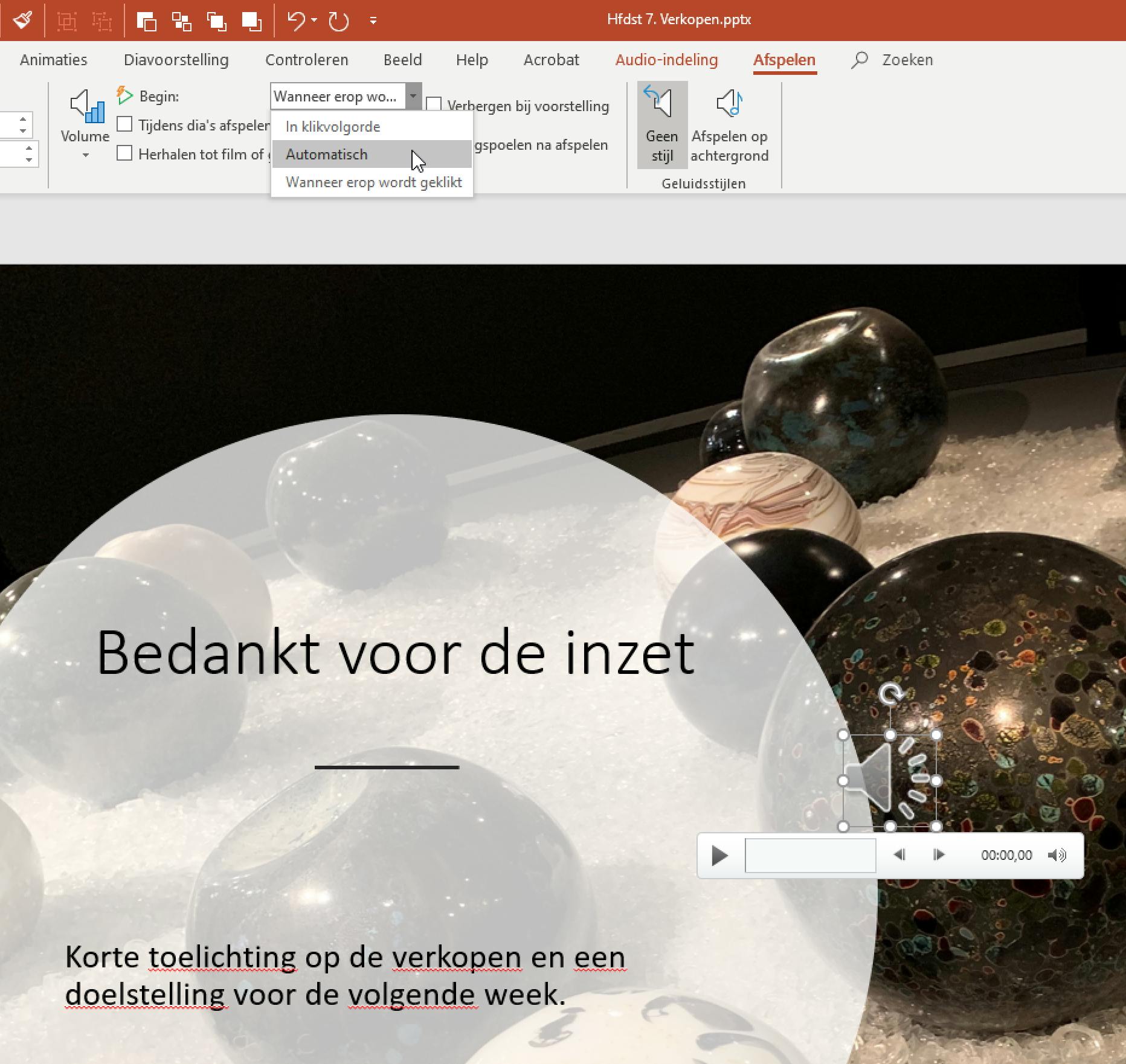 2 Wil je liever dat het geluid gelijk start bij het openen van de dia, dan is Automatisch de juiste keuze.