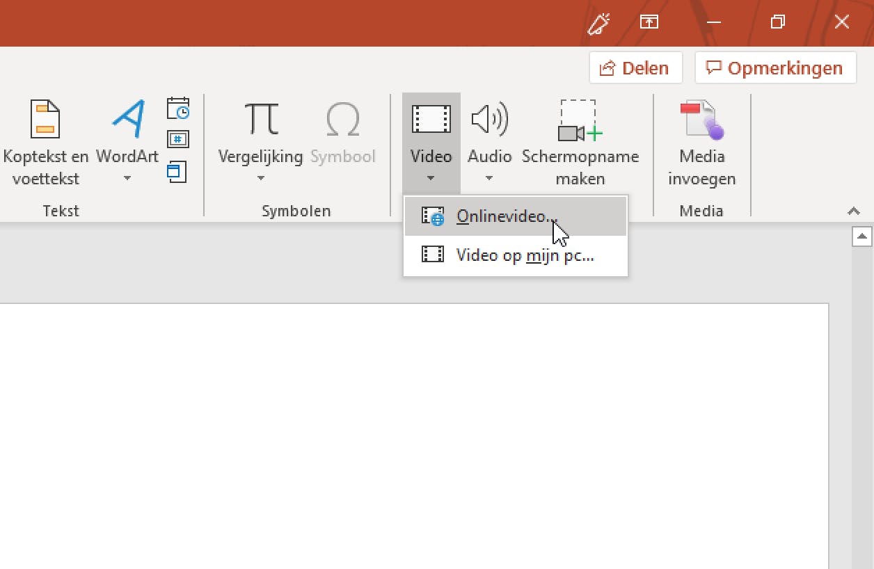 Wil je toch een video rechtstreeks uit een online bron invoegen, dan gaat dat als volgt.