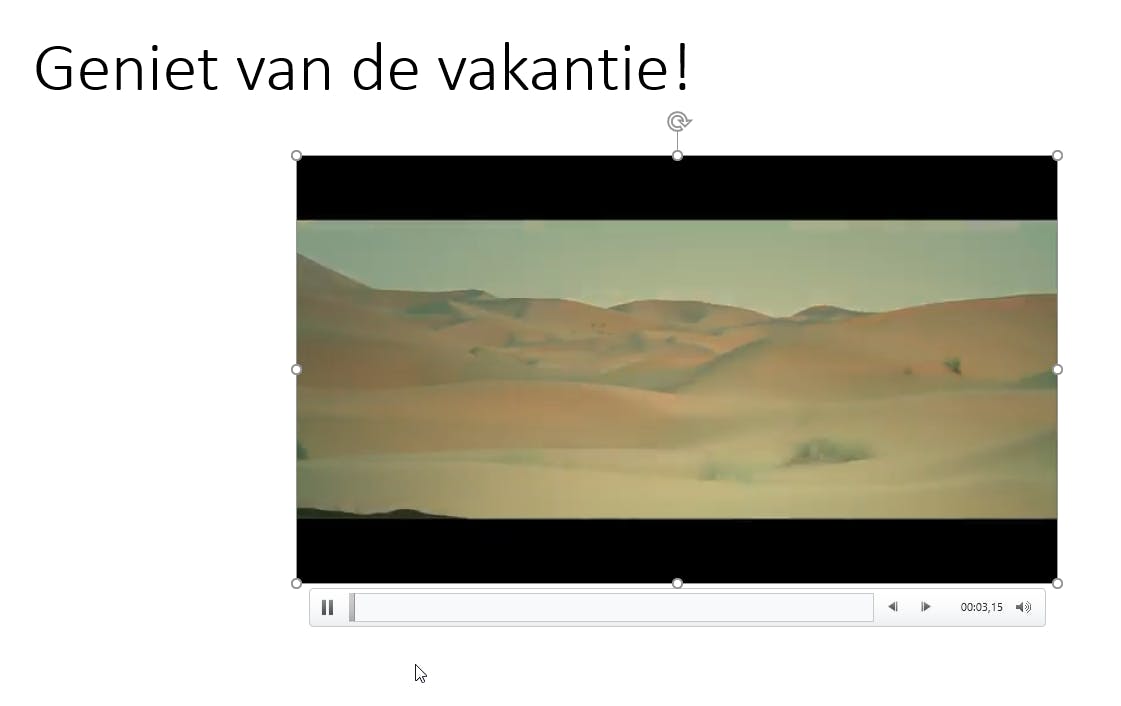 PowerPoint ondersteunt een groot aantal videobestandsformaten en codecs om af te spelen, eigenlijk alle gangbare. PowerPoint voegt de video in de dia in en laat die zien als een stilstaande afbeelding: het openingsscherm van de video. Je kunt deze afbeelding vergroten, verkleinen en zelfs draaien. Om de video te bekijken klik op Afspelen onder de video of op de werkbalk Video-indeling / Afspelen.