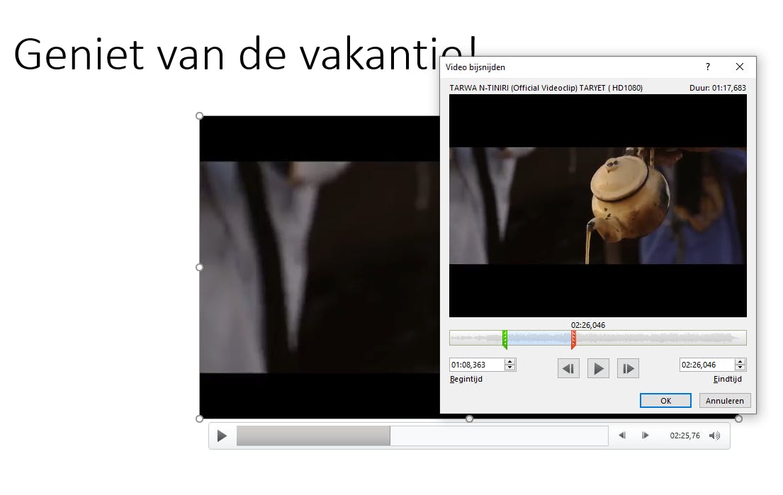 Heb je het juiste deel ingesteld, klik dan op OK om de video op deze wijze bij te snijden. Je kunt het altijd later nog weer aanpassen. PowerPoint laat het fragment verder ongemoeid, het wordt alleen voor deze presentatie zo ingesteld dat het later begint en of eerder ophoudt.