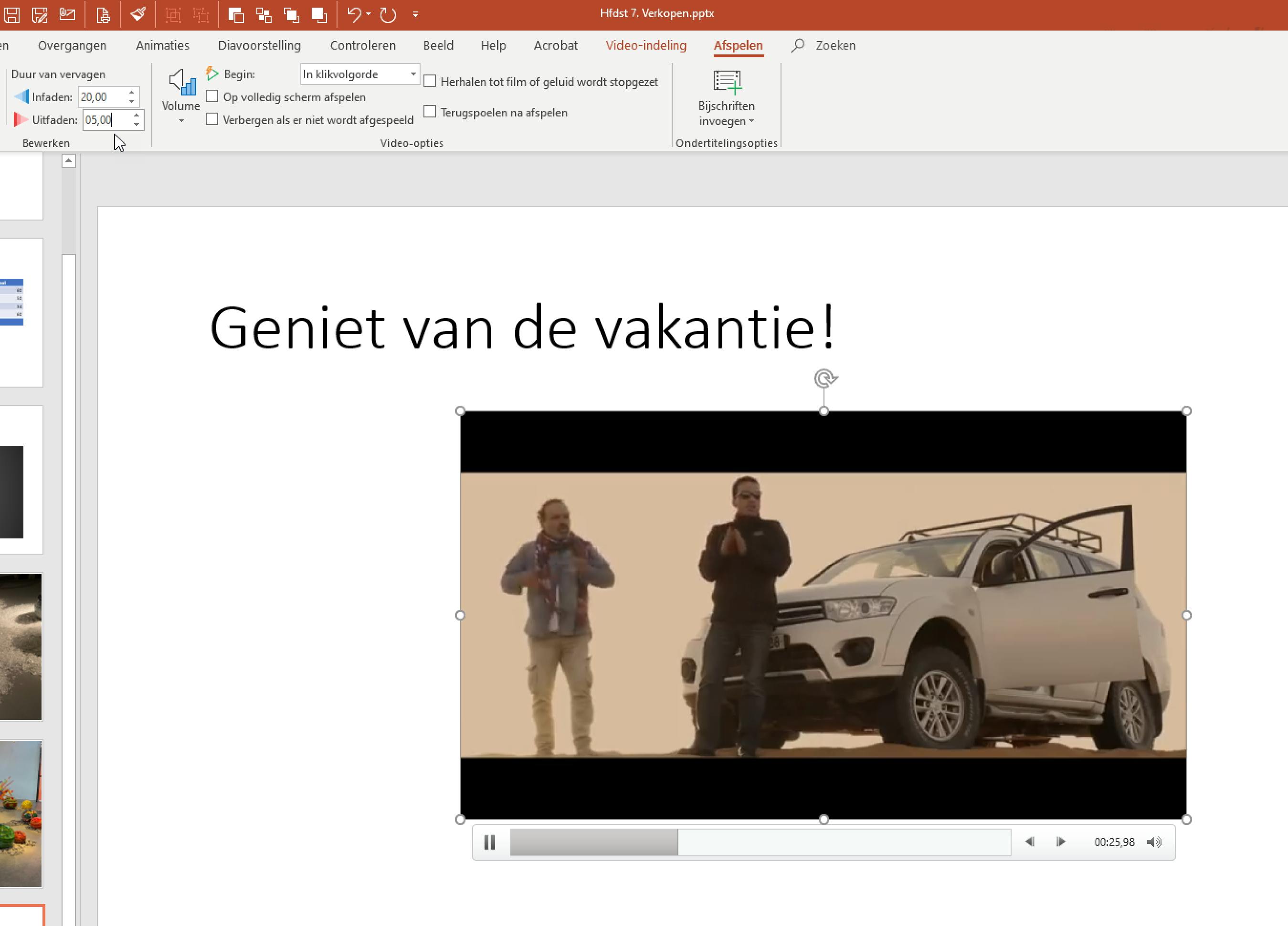 Als het fragment op de juiste lengte is, klik dan op OK om het nieuwe begin en einde vast te leggen. Je kunt het altijd later nog weer aanpassen. PowerPoint laat het originele bestand verder intact, het wordt alleen voor deze presentatie zo ingesteld dat het later begint en of eerder ophoudt. Wil je behalve later beginnen of eerder ophouden ook wat minder hard beginnen of eindigen, voeg dan een fade-in of fade-out toe. Dit kun je instellen bij Infaden en Uitfaden. Typ een tijd in of klik op de kleine pijltjes om de tijd voor het in- en uitfaden op te hogen.