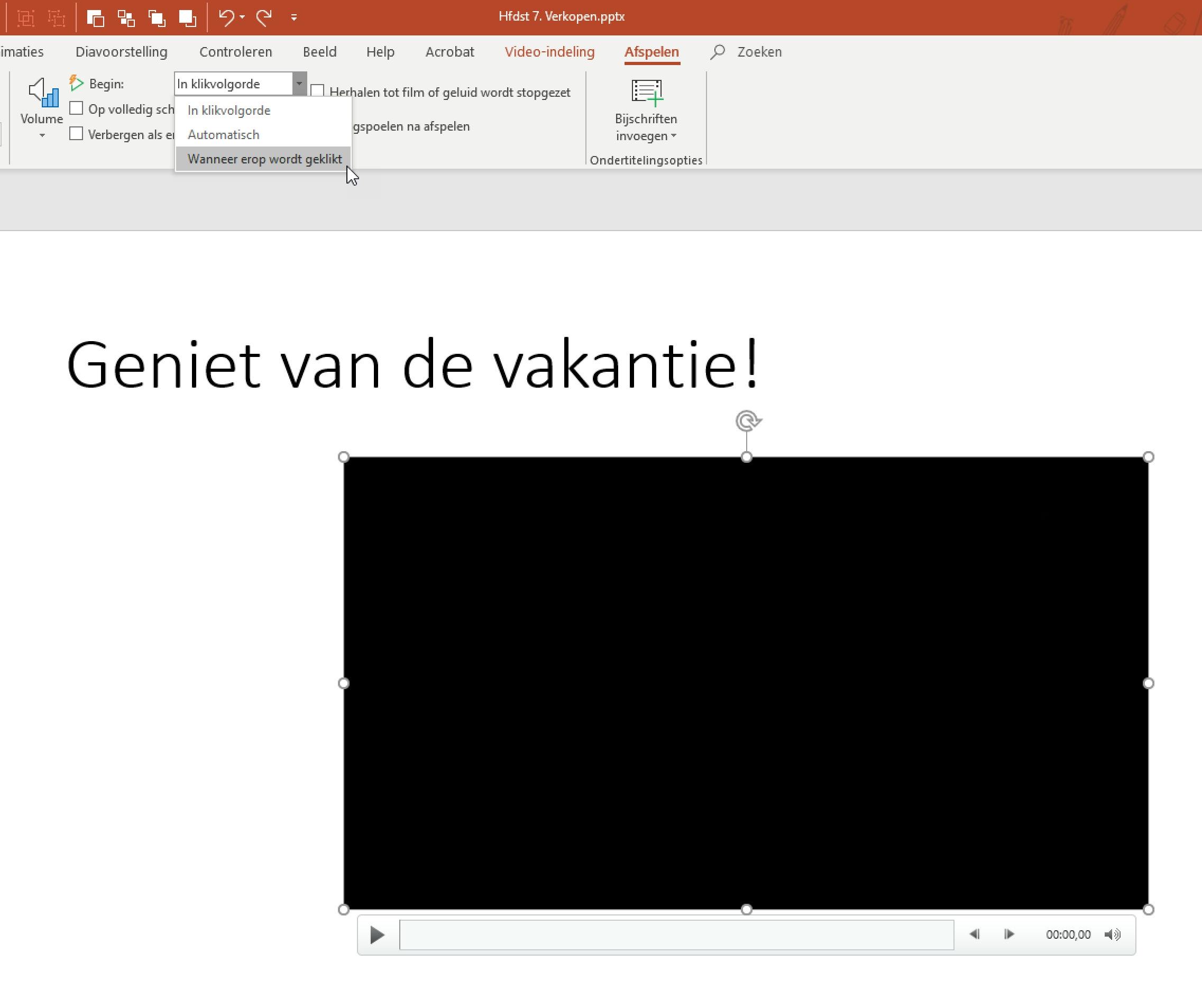 Wil je liever dat de video start zodra de dia te zien is, dan is de instelling Automatisch de beste keuze. Wil je liever dat de video afspeelt als je op de video klikt, dan gebruik je de optie Wanneer erop geklikt wordt. Hiermee houd je de volledige controle en kun je de video zelfs overslaan.