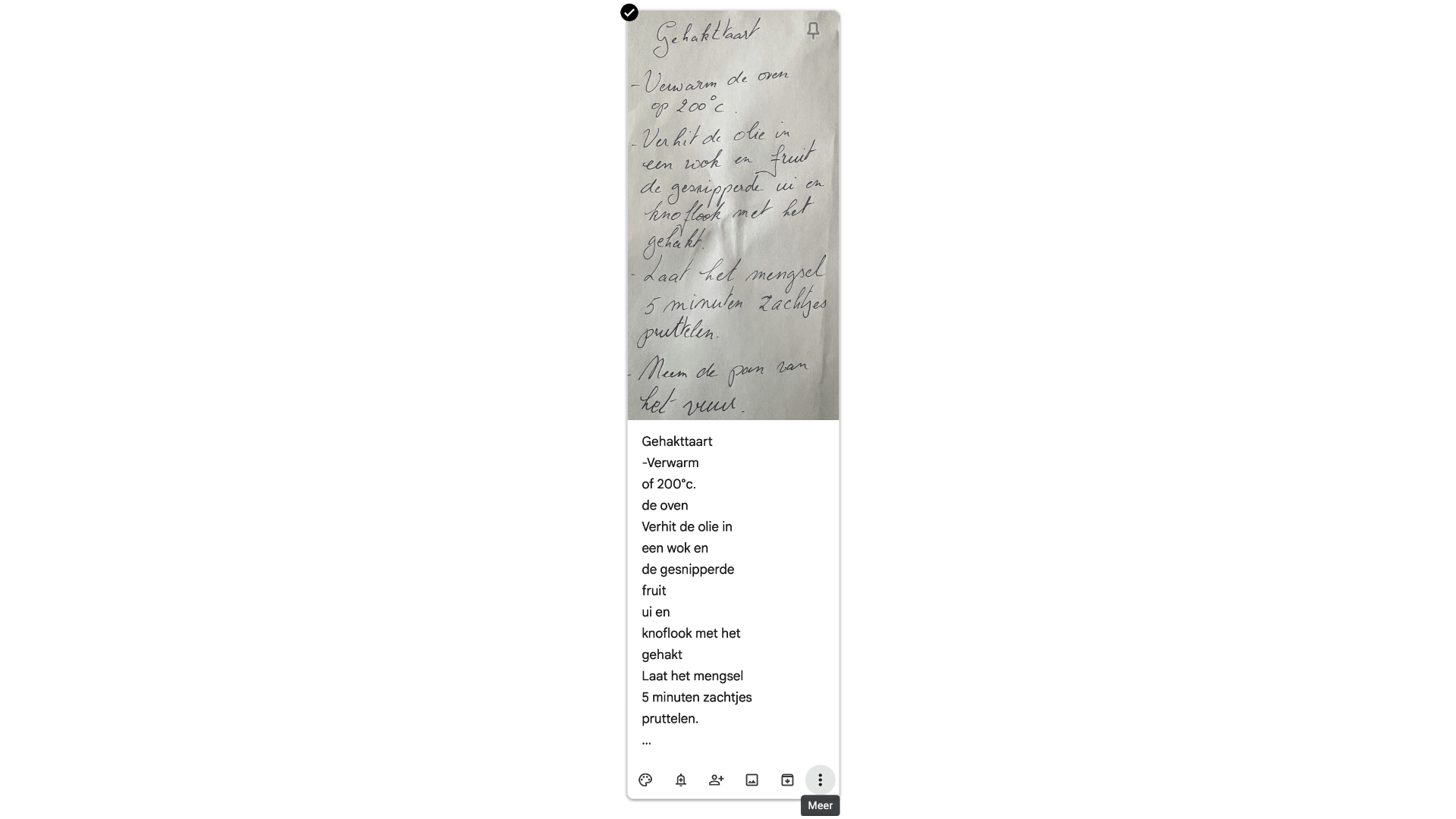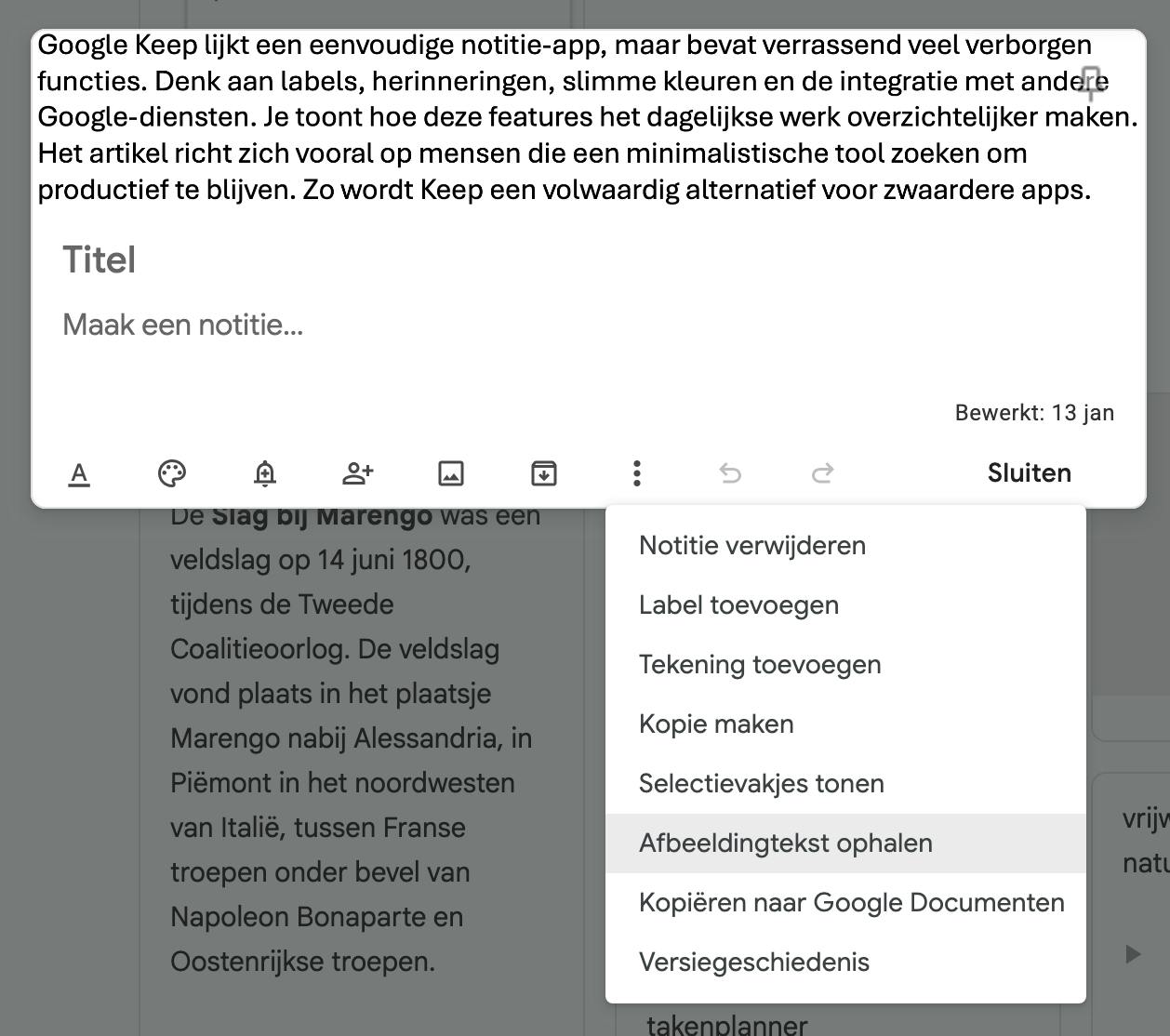 Soms ontvang je schermafbeeldingen of pdf’s waarin de tekst in een afbeelding staat. Het bespaart veel tijd als je die tekst via de OCR-functie van Google Keep laat extraheren. Zorg dat je op je desktop of laptop bent ingelogd bij Google en open https://keep.google.com. Maak een nieuwe notitie en klik op de knop om een afbeelding te uploaden. Navigeer naar de afbeelding of pdf en selecteer deze in Keep. Eenmaal geselecteerd, klik je onderaan op de drie verticale puntjes en kies je Afbeeldingstekst ophalen. Keep extraheert de tekst automatisch uit de afbeelding en plaatst deze onder de afbeelding in de notitie.