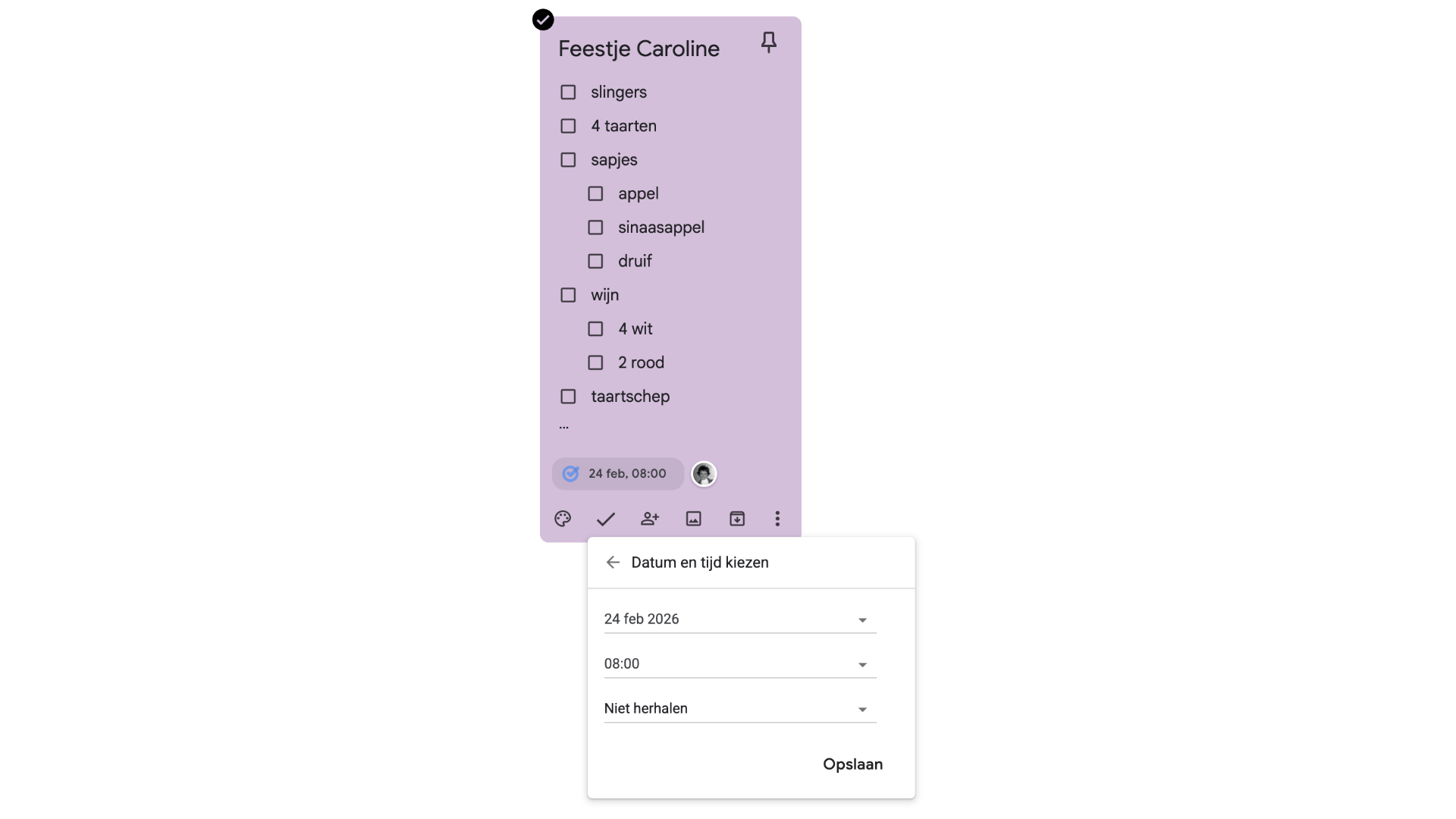 Het is eenvoudig om herinneringen aan je Keep-notities toe te voegen, zelfs bij notities die je met anderen hebt gedeeld. Open Keep op je mobiel of via de webversie. Klik op Herinneringen om een overzicht te zien van alle notities met naderende deadlines. Heb je nog geen herinneringen toegevoegd, dan is deze sectie leeg. Ga terug en open de notitie waarvoor je een herinnering wilt instellen. Klik op het klokpictogram. In het venster Later herinneren kies je een dag en tijdstip waarop je herinnerd wilt worden. Deze herinneringen zijn niet alleen zichtbaar in Keep. Je kunt ze ook bekijken, bewerken of voltooien via Google Agenda en Google Tasks.