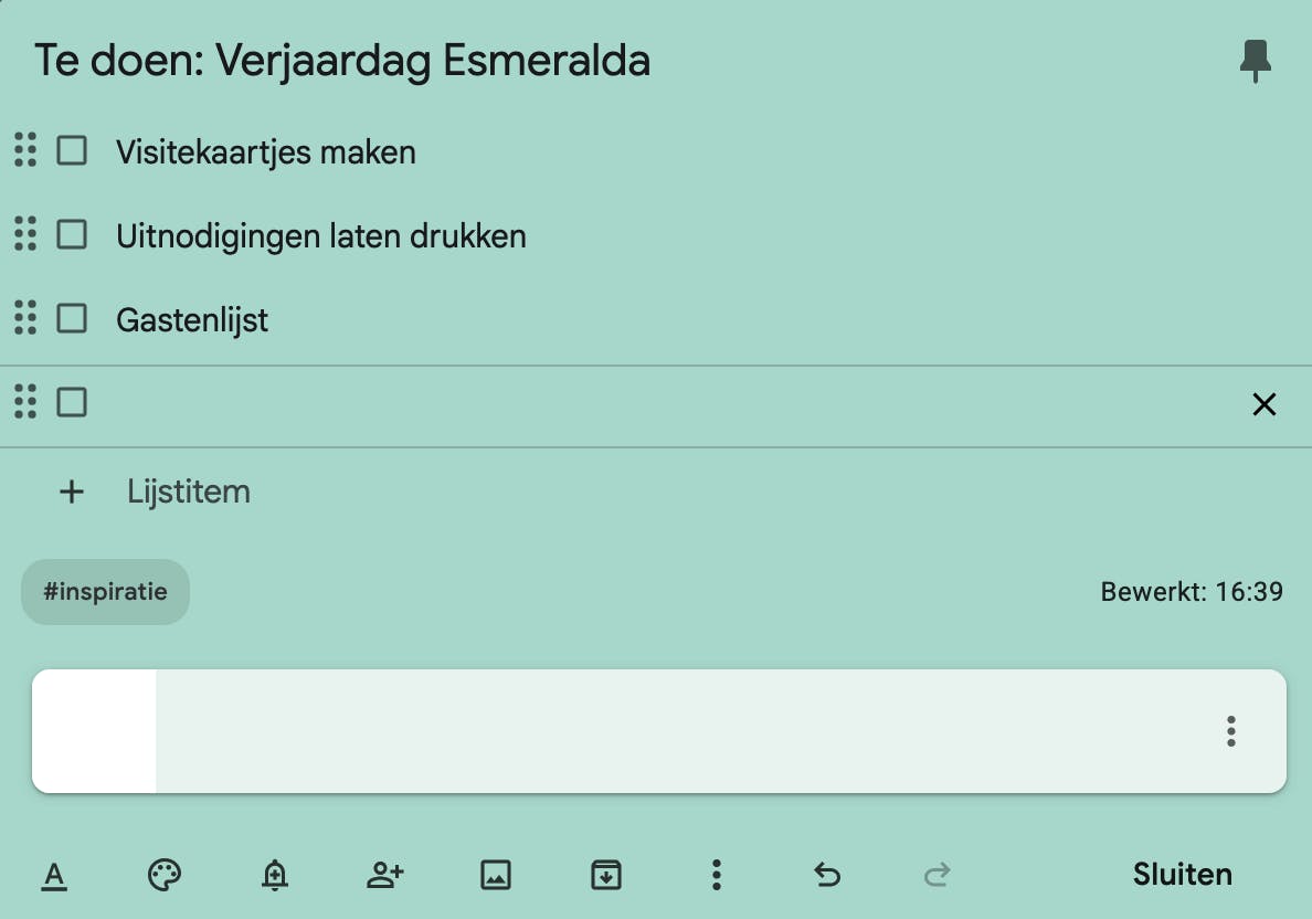 In plaats van losse notities te maken om dingen te onthouden, kun je in Google Keep ook checklists of to-do-lijsten aanleggen. Op de desktopversie gaat dat het makkelijkst. Begin een nieuwe notitie en klik op het pictogram Nieuwe lijst rechtsboven. In de notitie verschijnt een aankruisvakje waarbij je het eerste lijstitem typt. Met + Lijstitem voeg je vervolgens het volgende item toe en zo vul je stap voor stap de hele afstiplijst. Daarna kun je alsnog een titel voor de lijst noteren. Wanneer je een lijstitem wilt verwijderen, klik je op het kruisje rechts van het item. Aan de linkerkant van elk item zie je zes puntjes waarmee je het item kunt vastgrijpen en hoger of lager in de volgorde kunt slepen. In de mobiele app werkt het op dezelfde manier. Je selecteert eerst de notitie, tikt linksonder op het plusteken en kiest Selectievakjes. Vervolgens kun je lijstitems toevoegen, aanvinken, verwijderen of verslepen, net als op de desktopversie.
