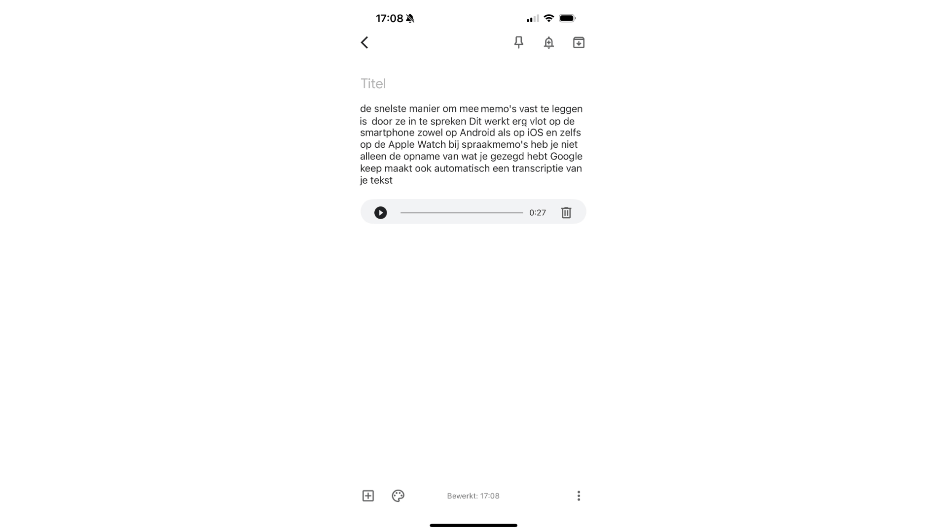 De snelste manier om memo’s vast te leggen is door ze in te spreken. Dit werkt erg vlot op de smartphone, zowel op Android als iOS, en zelfs op de Apple Watch. Bij spraakmemo’s heb je niet alleen de opname van wat je hebt gezegd, Google Keep maakt ook automatisch een transcriptie van de opname . Open de mobiele app en tik onderaan op het microfoonpictogram. De melding Spreek nu verschijnt, waarna je dicteert wat je wilt vastleggen. Zodra je stopt met praten, stopt ook de opname. Daarna kun je de notitie van een titel voorzien. Ook in de desktopversie kun je spraakmemo’s beluisteren en de transcriptie bekijken. Een minpuntje: soms wordt de opname niet opgeslagen en blijft alleen de transcriptie over. Bovendien moet je vlot spreken, want zodra je pauzeert, wordt de opname onderbroken. Het is dus handig om even te oefenen om de techniek van spraakmemo’s in Google Keep onder de knie te krijgen.