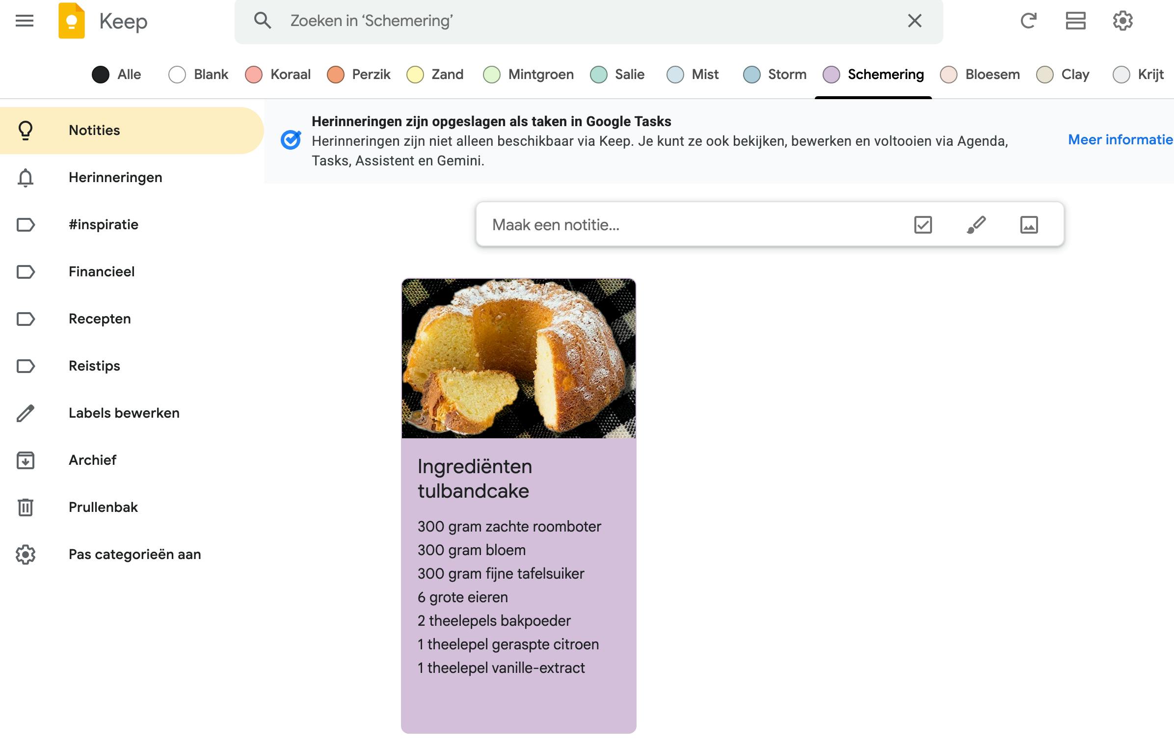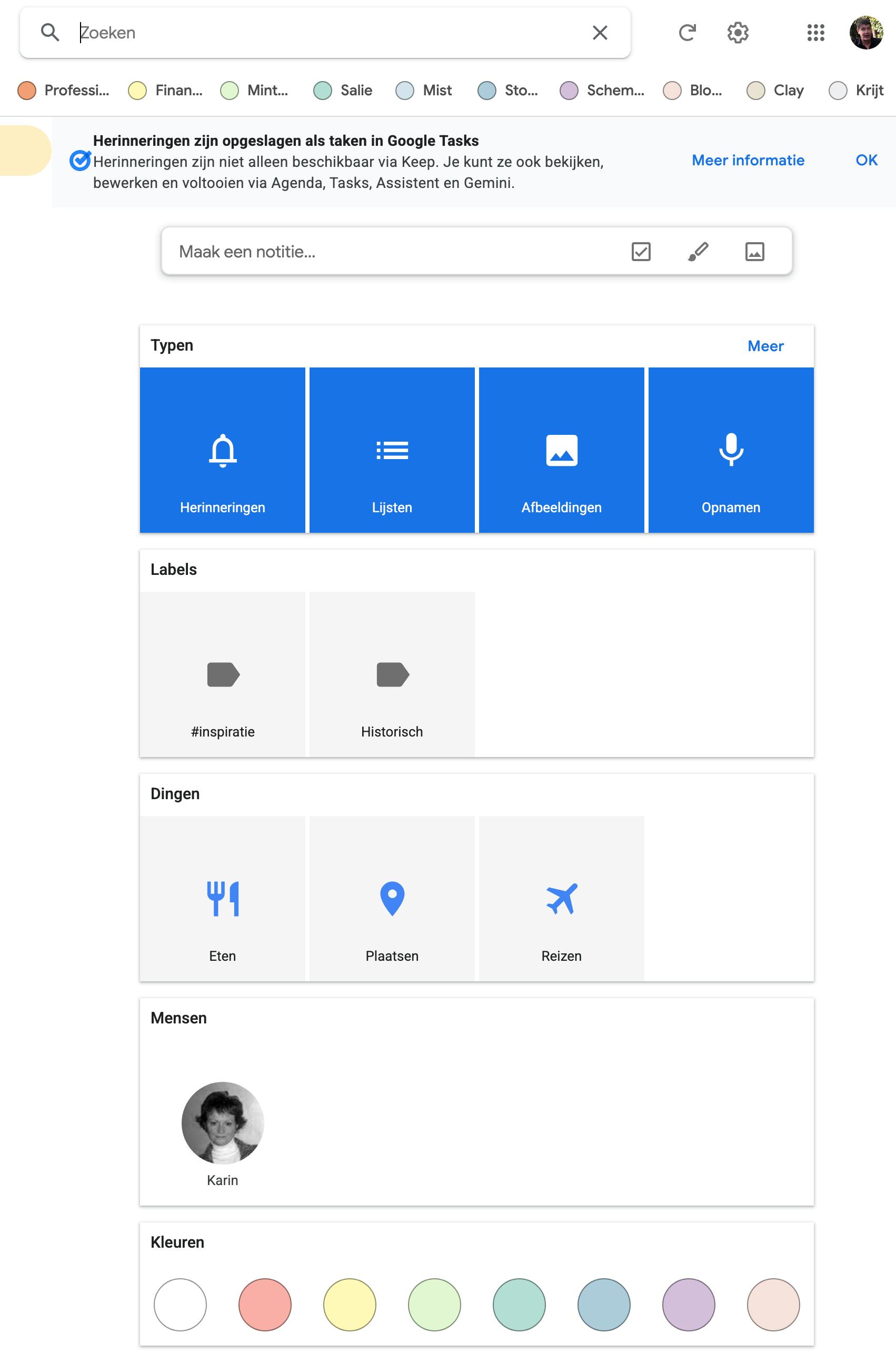 Je kunt het zoekvak in Google Keep uiteraard gebruiken om zoektermen in te geven, maar de echte kracht ervan zie je pas wanneer je in een leeg zoekvak klikt. Keep vraagt dan welk type informatie je zoekt, zoals herinneringen, lijsten, afbeeldingen of opnamen. Je kunt hier ook gericht zoeken op een bepaald label of op een specifieke kleur. Daarnaast kent Google Keep automatisch labels toe. Toen we bijvoorbeeld een recept toevoegden, werd dit door Keep zelfstandig als Eten gecategoriseerd. Bovendien kun je filteren op de personen met wie je notities deelt.