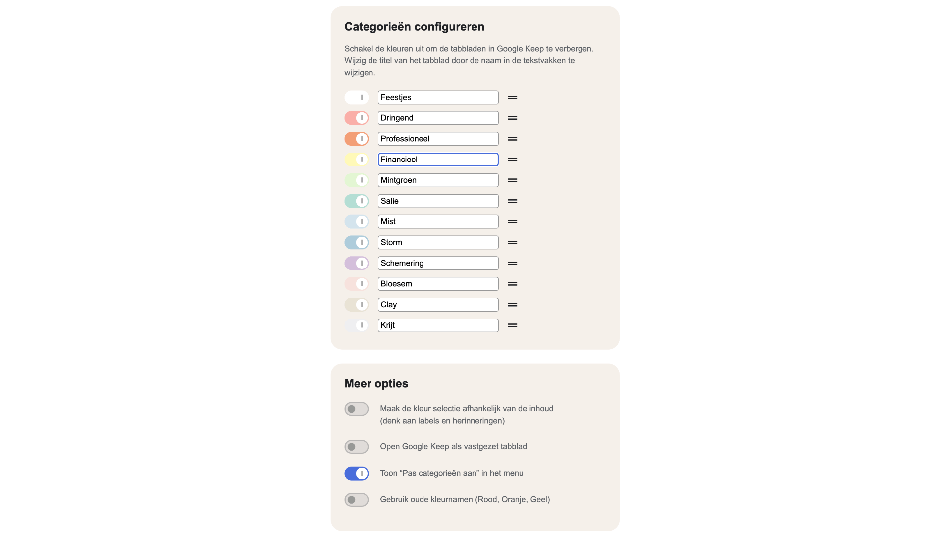 Om een bestaande notitie van een kleur te voorzien, open je de notitie en klik je onderaan op het pictogram van het schilderspalet. Om de kleuren nog slimmer in te zetten, pas je de namen aan. Selecteer in de linkerkolom de knop Pas categorieën aan. Hier kun je niet alleen nieuwe kleuren selecteren, je kunt de kleuren ook van functionele namen voorzien. Rood wordt bijvoorbeeld Dringend, Koraal wordt Financieel, Zand wordt Reizen enzovoort. Het is zelfs mogelijk om de volgorde van de kleuren te wijzigen.