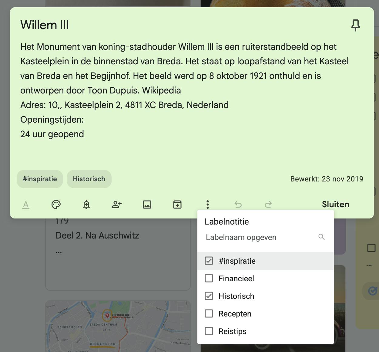 Labels zijn een handige manier om notities te categoriseren. Je gebruikt ze om notities te groeperen per project, onderwerp of prioriteit en om ze daarna snel terug te vinden via de zoekfunctie. Zo blijft het digitale spoor op je toestel overzichtelijk en beperk je het aantal losse notities dat je moet doorzoeken. Om labels aan te maken, gebruik je in de linkerkolom de knop Labels bewerken. Daar kun je nieuwe labels toevoegen en bestaande labels hernoemen. Wil je een label aan een notitie koppelen, dan selecteer je de notitie en klik je op de drie verticale puntjes, waarna je Label toevoegen kiest .