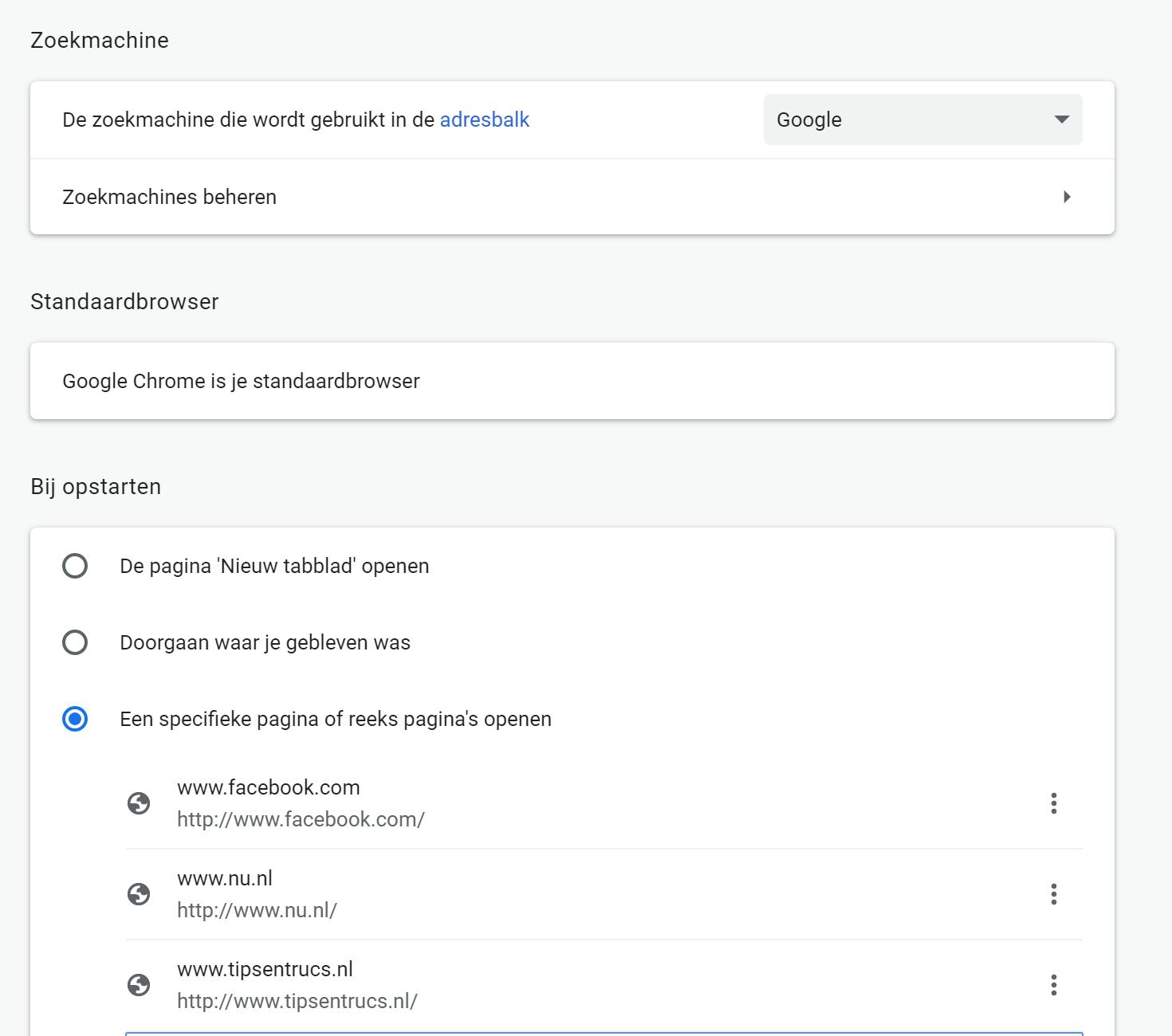 Chrome laat je zelf bepalen wat je wilt zien als je de browser opstart. Bekijk je altijd als eerste het nieuws, check je je social media en log je in op je mail? Kies er dan voor om deze tabbladen standaard te laten openen als Chrome opstart. Klik hiervoor op de drie puntjes rechts bovenin om de Instellingen te openen. Navigeer naar beneden en selecteer onder Bij opstarten de optie Een specifieke pagina of reeks pagina’s openen. Klik op Een nieuwe pagina toevoegen en voer de url in. Klik op Toevoegen en doe dit voor eventuele andere pagina’s ook. Wil je dat je browser iedere keer de pagina’s opent die je op dit moment open hebt staan, kies dan gewoon voor de optie Huidige pagina’s gebruiken.