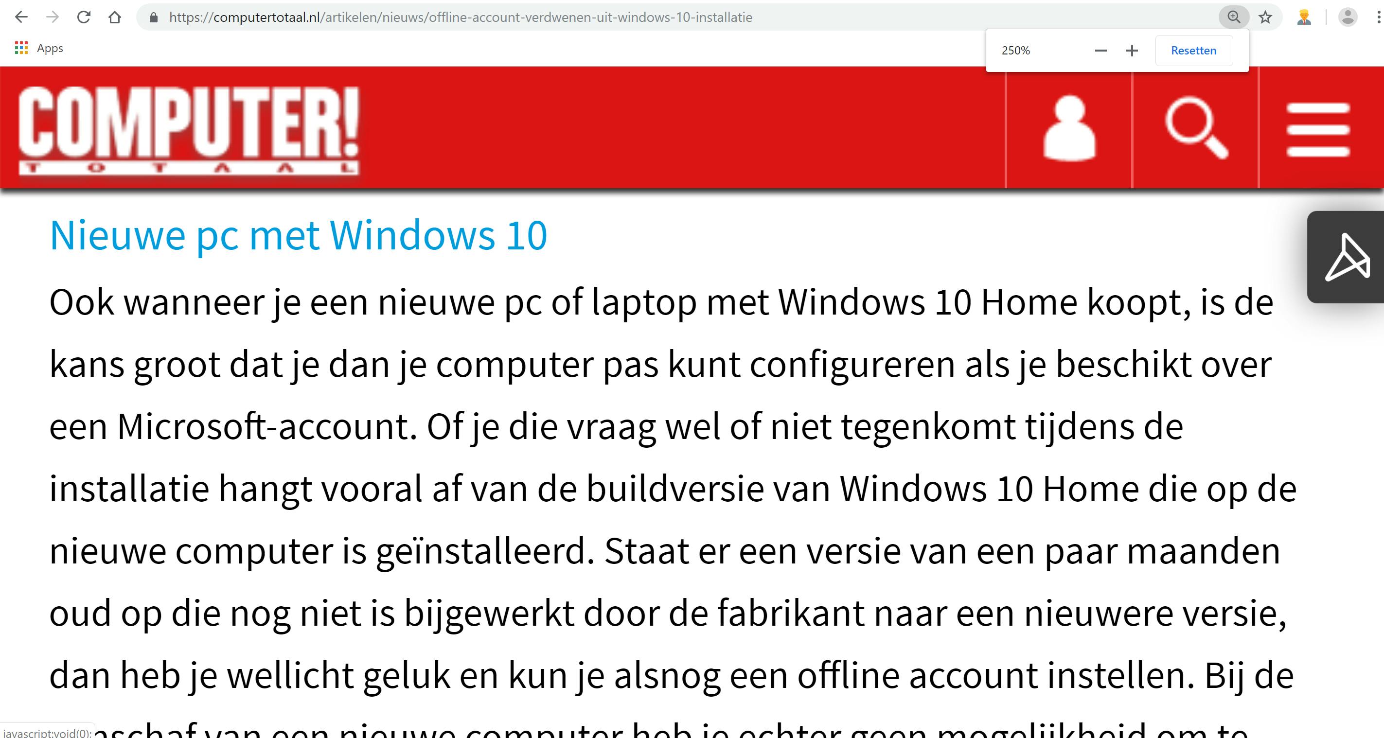 Heb je er moeite mee om de pagina’s goed te kunnen lezen, selecteer dan achter Lettergrootte de optie Groot of Zeer groot. Dit werkt overigens niet op alle sites. Om een pagina dan nog goed te kunnen lezen, kun je inzoomen door de toetscombinatie Ctrl++ (plus) te gebruiken. Uitzoomen doe je dan weer met Ctrl+- (min), Ctrl+0 om weer terug te keren naar 100% of door op Resetten te klikken in de pop-up die verschijnt.