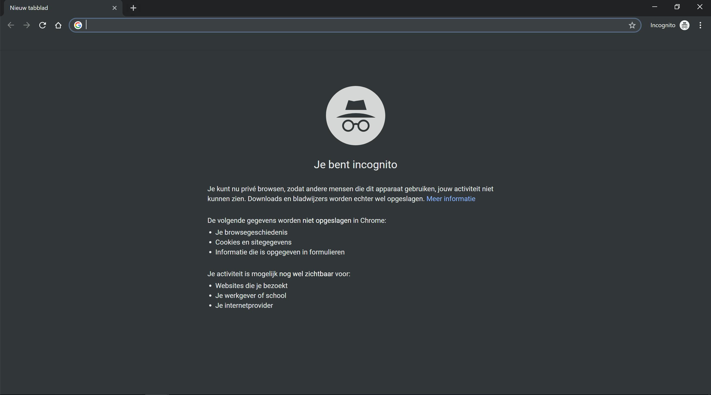 Met Chrome is het mogelijk om anoniem websites te bezoeken door de incognito-modus te gebruiken. Druk hiervoor op de toetscombinatie Ctrl+Shift+N of klik op de drie stipjes rechtsboven aan het venster en kies voor Nieuw incognitovenster. Chrome bewaart nu geen geschiedenis en slaat ook geen cookies op van de sites die je bezoekt. Je bent natuurlijk niet geheel incognito, aangezien de beheerder van de bezochte website (en eventueel je provider) wel kunnen zien welke sites je hebt bezocht aan de hand van je ip-adres. Je herkent een incognito-tabblad door de grijze achtergrond en doordat er Incognito naast de adresbalk wordt weergegeven.