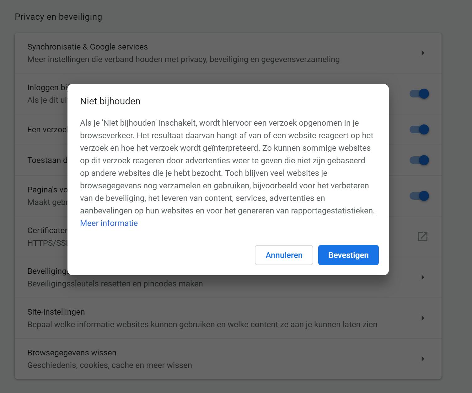 Nu we bij de geavanceerde instellingen zijn aanbeland, bekijken we ook eens nader de instellingen onder het kopje Privacy en beveiliging. Zo kun je hier bijvoorbeeld instellen dat de websites zo min mogelijk gegevens van jou mogen verzamelen door de schuif achter Een verzoek voor niet bijhouden met je browseverkeer verzenden aan te zetten en de actie te bevestigen. Besef je wel dat het geen garantie is dat een website zich hieraan houdt.