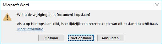 Als Word aangeeft dat er iets mis is gegaan, moet je extra alert zijn en niet zomaar op OK klikken. Als er herstelbestanden beschikbaar zijn, krijg je bij het afsluiten van Word de keuze om herstelbestanden te wissen of behouden. De bestanden verwijderen is de standaardoptie, dus als je niet goed oplet en op OK klikt, ben je hiermee je herstelbestanden alsnog kwijt. De asd-bestanden die je eerder handmatig hebt veiliggesteld laat Word met rust zodat je je een foutje kunt permitteren.