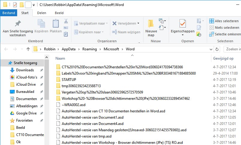 Open de map die je gevonden hebt bij de vorige stap in Windows Verkenner. In deze map vind je geen Word-documenten die eindigen op .docx (bijvoorbeeld mijndocument.docx), maar hebben de herstelbestanden het achtervoegsel .asd (bijvoorbeeld AutoHerstel-versie van mijndocument.asd). Dit type bestand kun je niet zomaar openen door erop te dubbelklikken. Kopieer alle asd-bestanden (ook uit de submappen!) naar een andere locatie, bijvoorbeeld je bureaublad, om te voorkomen dat je ze per ongeluk (automatisch) laat verwijderen door Word.
