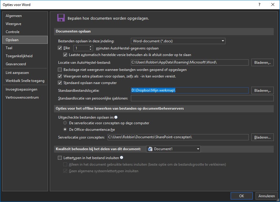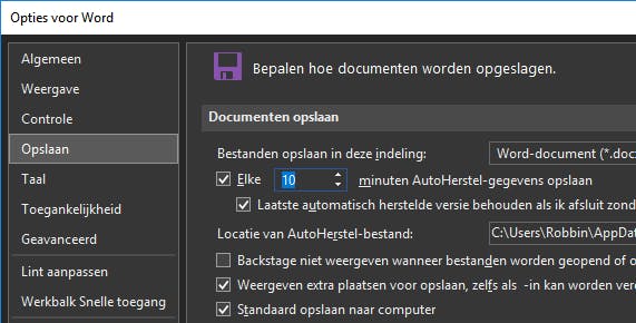 Maak een map aan voor je Word-documenten in OneDrive of Dropbox. Open Word en ga naar Bestand / Opties / Opslaan. Klik achter Standaardlocaties op Bladeren en wijs de map aan die je zojuist hebt aangemaakt in je favoriete clouddienst. Als je vanaf nu Opslaan of Opslaan als gebruikt, wordt deze map automatisch aangeboden als opslaglocatie. Handige bijkomstigheid is dat je bestanden automatisch in de cloud belanden. Hierdoor kun je erbij op al je apparaten en via www.onedrive.com of www.dropbox.com in je browser. Omdat de bestanden ook extern zijn, overleven je documenten een computercrash, diefstal of andere ellende.