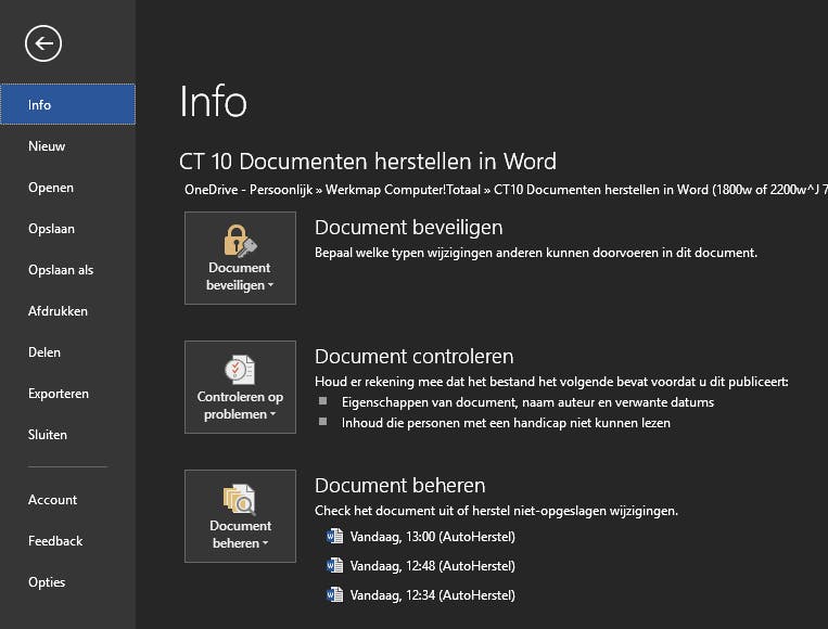 Als je een fout maakt tijdens het bewerken van een document, bijvoorbeeld twee keer knippen zonder de plakken, heeft Word een extra vangnet dat ook werkt via de AutoHerstel-functie. Klik op Bestand en kijk onderaan op het tabblad Info. Naast de knop Document beheren zie je automatische momentopnamen (met tijdsaanduiding). Door op een momentopname te klikken, bijvoorbeeld van tien minuten geleden, kun je de inhoud van deze ‘snapshot’ te bekijken en vergelijken met je huidige tekst. Gebruik Bestand / Opslaan als om de momentopname te bewaren of kopieer/plak de tekst die je mist vanuit de momentopname naar je werkdocument.