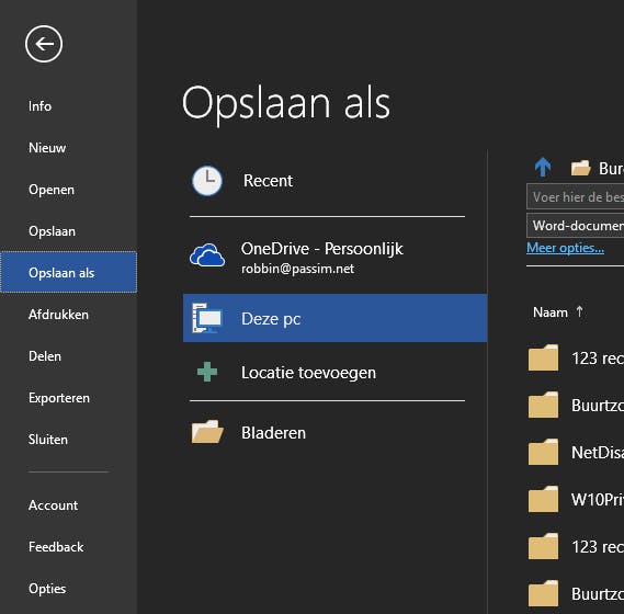 Er is een verschil tussen Bestand / Opslaan en Bestand / Opslaan als. Als je een document opent dat je via mail, Slack of andere bron hebt ontvangen is het goed om jezelf aan te leren altijd eerst de optie Opslaan als te gebruiken. Hiermee bewaar je het document bewust op een locatie die je straks weer kunt terugvinden. Doe je dit niet, dan belandt het document in je downloadmap of andere (tijdelijke) locatie en kun je het zonder hulpmiddelen mogelijk niet meer terugvinden.