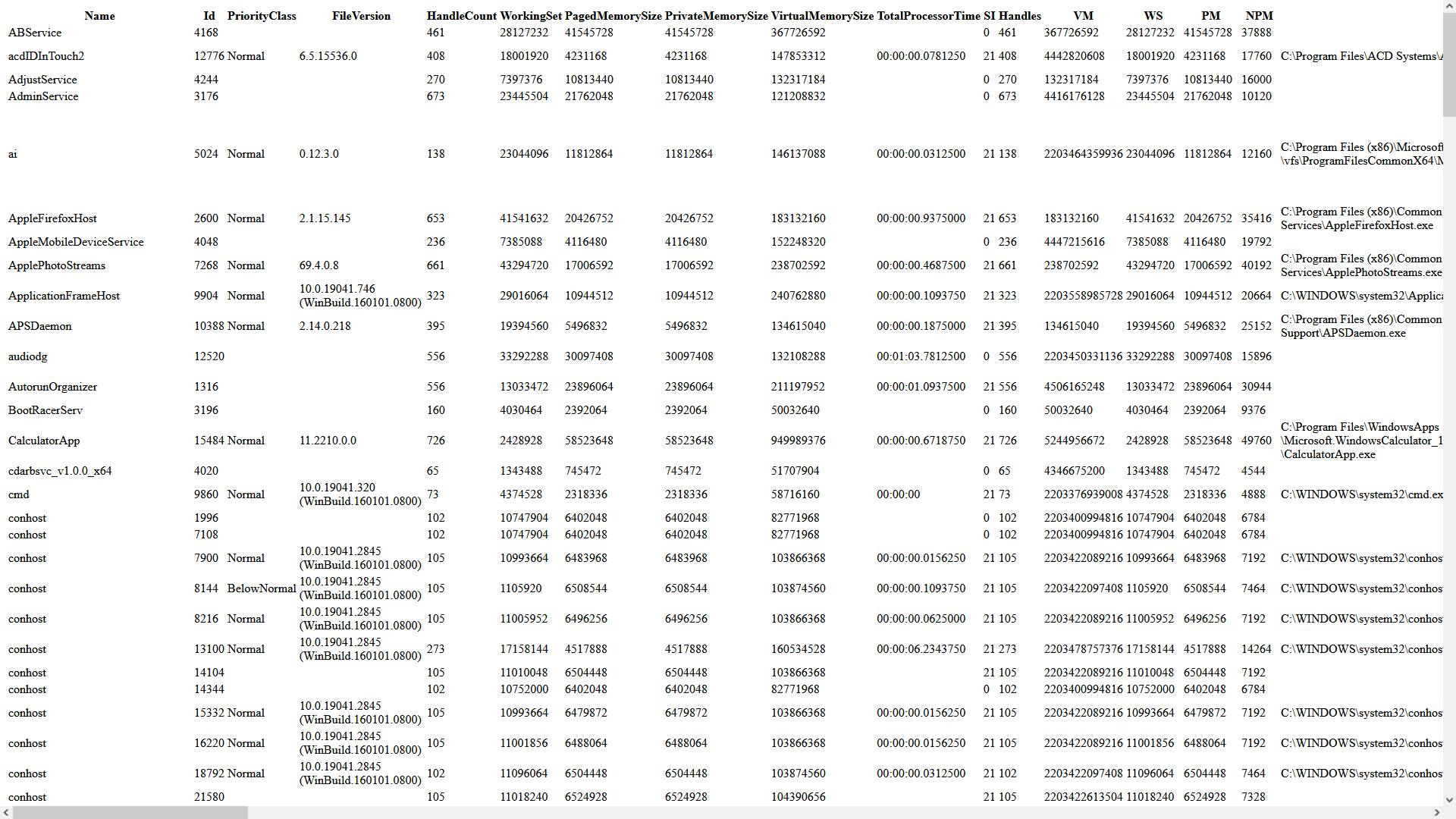 Maar waarom zou je dat willen wanneer Taakbeheer voldoet? Taakbeheer geeft je een momentopname die je hooguit zou kunnen bewaren door een reeks schermafdrukken van het venster te maken. Vraag je zo’n lijst op in PowerShell, dan kun je hem ook bewaren en later vergelijken met een soortgelijke lijst die je op een ander moment maakt.