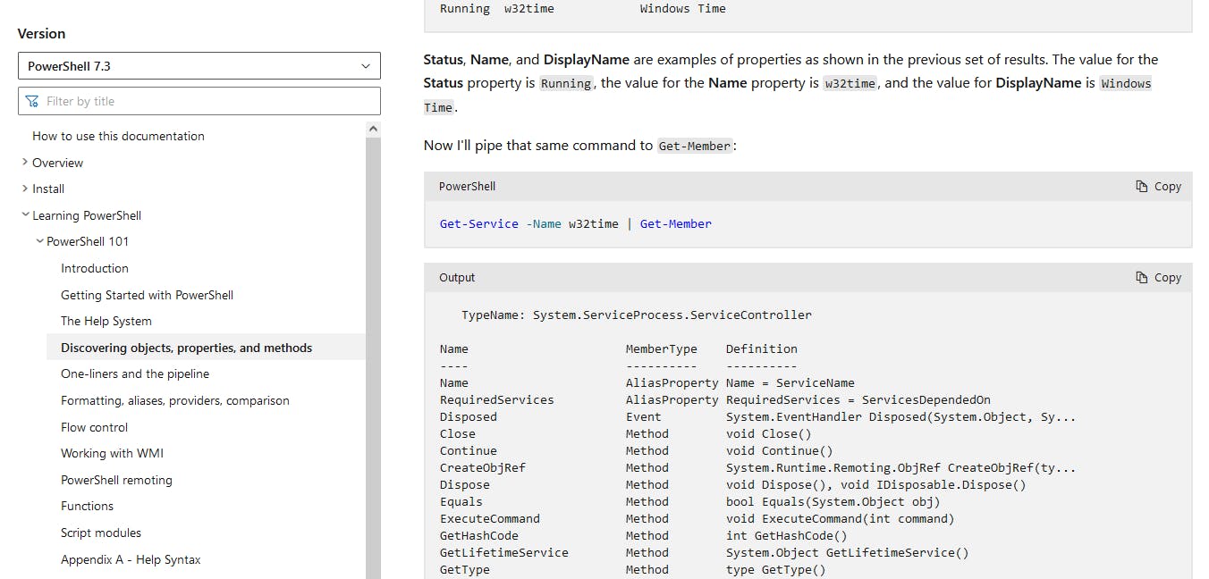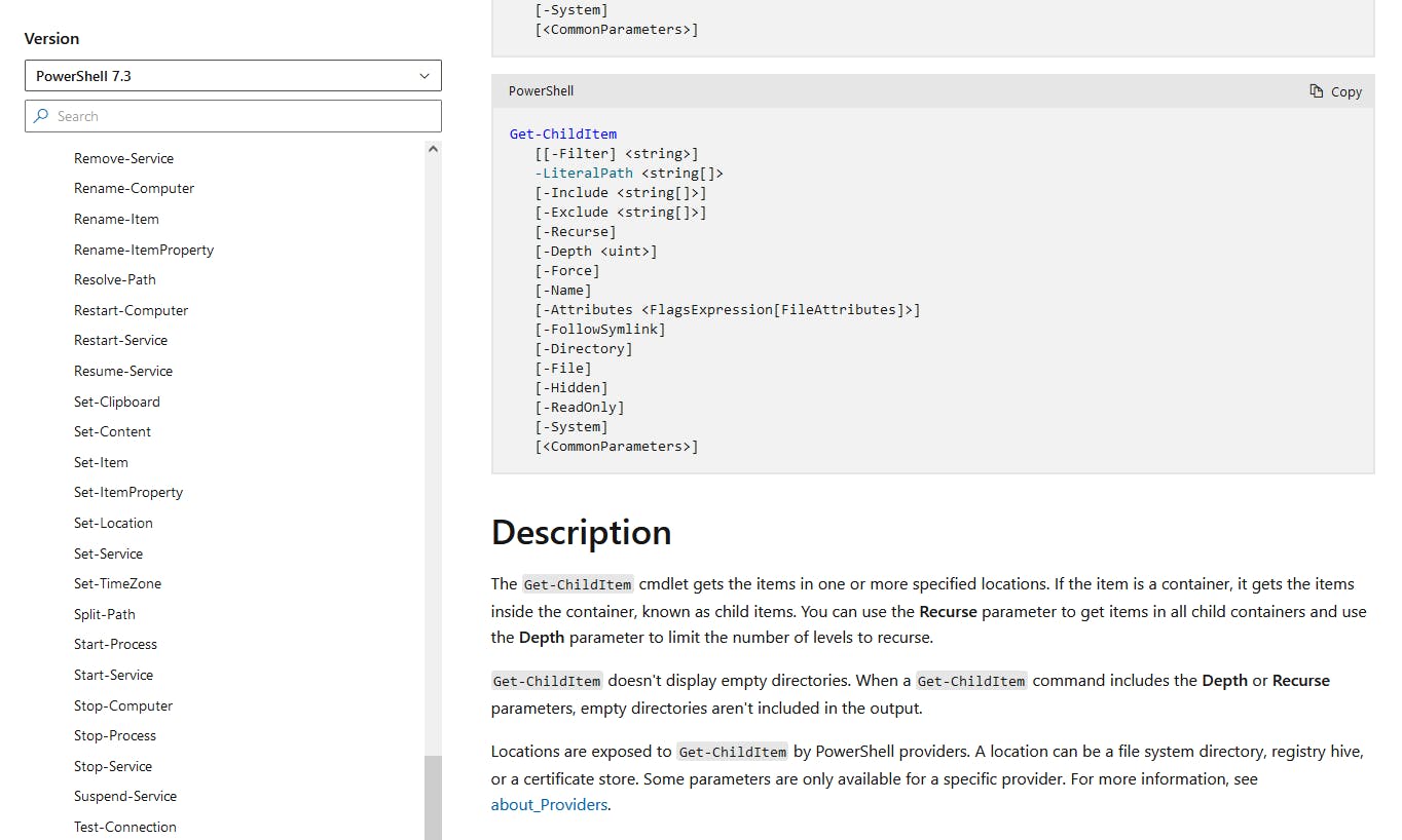 Dat ziet er nog altijd niet al te informatief uit voor beginners. Dat komt omdat PowerShell standaard alleen een beknopte lokale helpfunctie biedt. Voegen we aan ons commando de parameter -Online toe, dan opent PowerShell onze browser en krijgen we wél de uitgebreide hulp die we mogen verwachten.