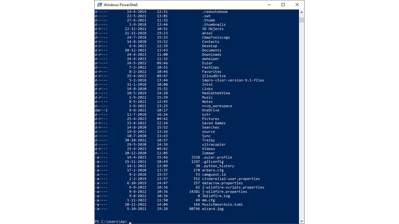 Net als bij de Opdrachtprompt begin je in een map – in dit geval die van de ingelogde gebruiker – en het enige wat afwijkt, is de blauwe achtergrondkleur en de letters PS voor de mapnaam om aan te duiden dat je je in PowerShell bevindt. Iets wat de venstertitel natuurlijk ook al verraadt.