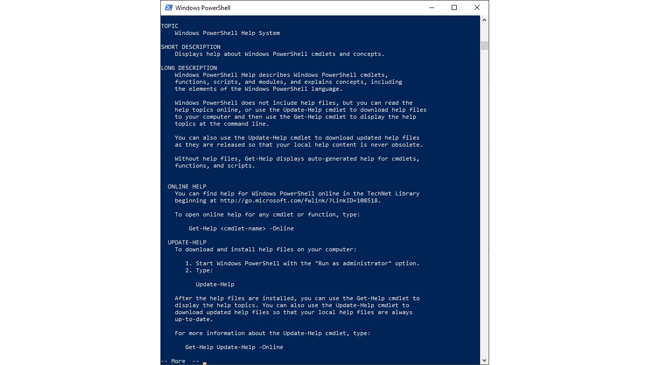 Als de installatie klaar is, verschijnt de gevraagde hulp voortaan binnen het PowerShell-venster. Dat gebeurt overigens wel in losse segmenten. Om alles in één keer te zien, voeg je de parameter -full toe, en ben je alleen geïnteresseerd in gebruiksvoorbeelden dan is er -examples.