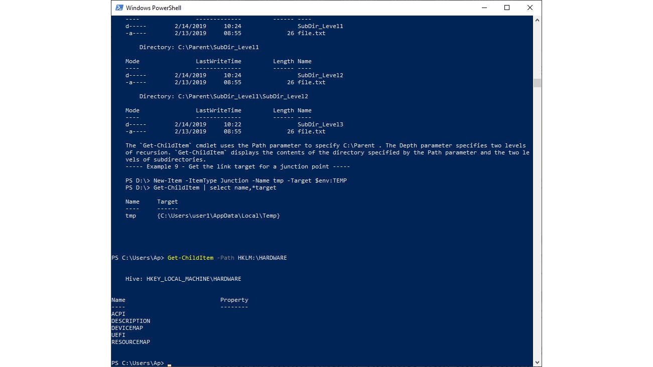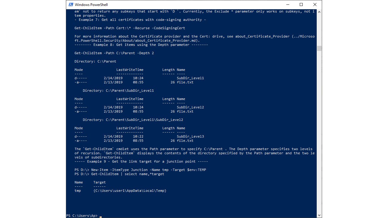 In ons eerste voorbeeld zag je de standaardweergave van de inhoud van een map. Net als bij het commando dir in Opdrachtprompt biedt Get-ChildItem allerlei manieren om de uitvoer te filteren met een jokerteken (*) of uit te breiden naar onderliggende mappen met de parameter -recurse.