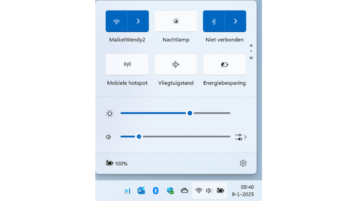 Rechtsonder vind je het menu met de snelle instellingen. Klik maar eens op het volumepictogram (de speaker) om dat te openen. Je krijgt hiermee vlot toegang tot diverse opties zonder dat je in de reguliere instellingen hoeft te graven. Denk aan onderdelen als Nachtlamp, Toegankelijkheid en bluetooth. Bij de snelle instellingen is er plek voor zes onderdelen. Draai aan het scrolwiel om meer opties te tonen. Wil je een bepaalde instelling bovenaan weergeven? Klik dan op dit pictogram en sleep het met ingedrukte muisknop naar de gewenste plek.