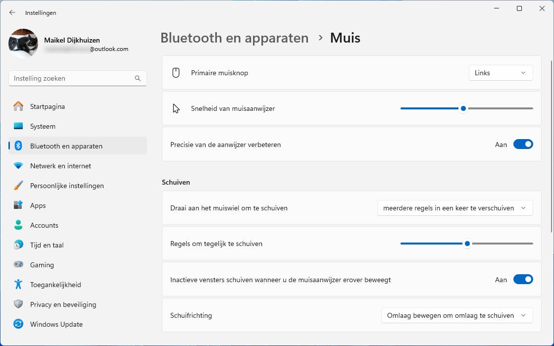 Wil je sneller of juist langzamer door (web)documenten scrollen? Pas dan de scrolsnelheid aan. Open de Instellingen en navigeer naar Bluetooth en apparaten / Muis. Je beweegt de schuifknop achter Regels om tegelijk te schuiven naar rechts of links, om respectievelijk een hogere of lagere snelheid in te stellen. Draai in een document nu eens aan het scrolwiel om de nieuwe waarde te testen. Overigens kun je in hetzelfde instellingenvenster ook de snelheid van de muisaanwijzer wijzigen.